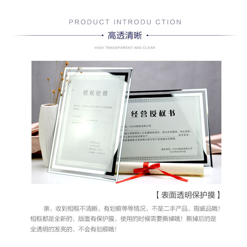 2020新款高档时尚创意居家摆件水晶玻璃相框5寸6寸7寸A4授权牌展示牌荣誉证书框奖状裱框营业执照横竖台牌