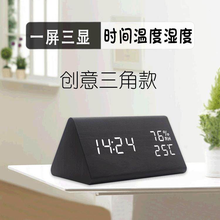 创意三角形木头钟电子钟台钟桌钟时钟新款多功能温湿度闹钟现货