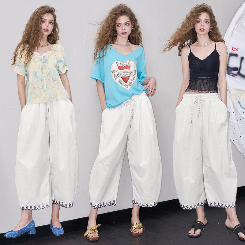 妖精的口袋镂空刺绣白色镰刀裤女2025夏新款宽松休闲显瘦九分裤子