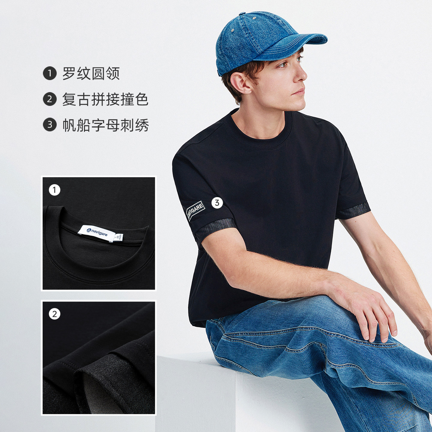 Navigare意大利小帆船黑色圆领短袖T恤男2026夏季纯棉凉感体恤衫