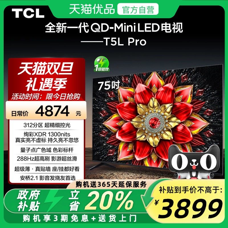 TCL电视 75T5L Pro 75英寸 QD-Mini LED 绚彩XDR1300nits超薄电视