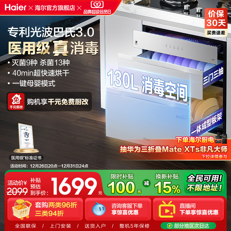 海尔灭菌舱130L消毒柜家用小型嵌入式碗柜厨房烘干一体EB130H灰色