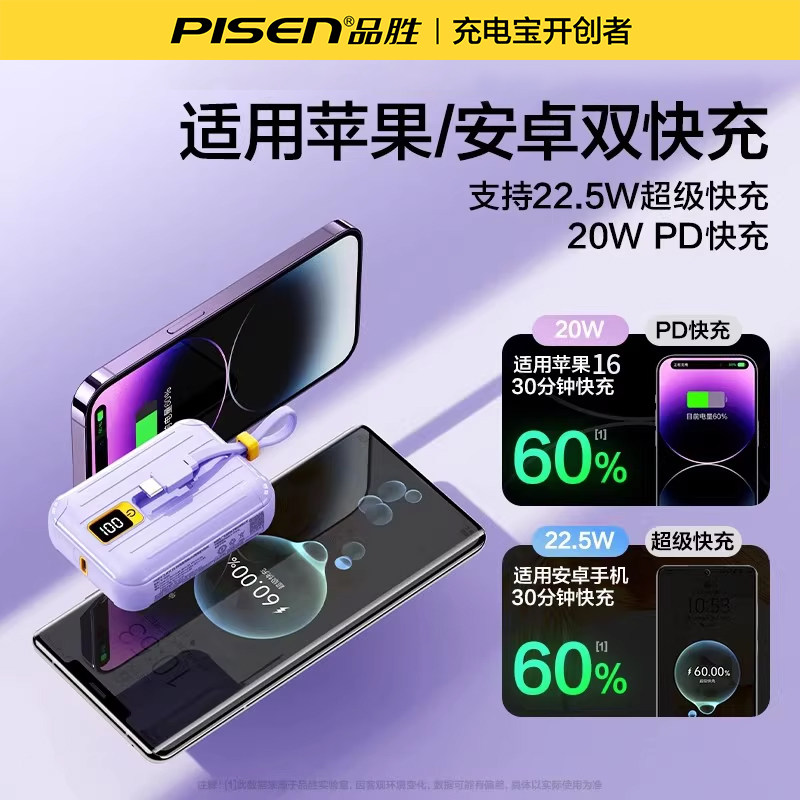 【充电宝3C认证可上飞机】品胜mini充电宝自带线10000毫安30W闪充小巧便携便携移动电源适用小米苹果17专用