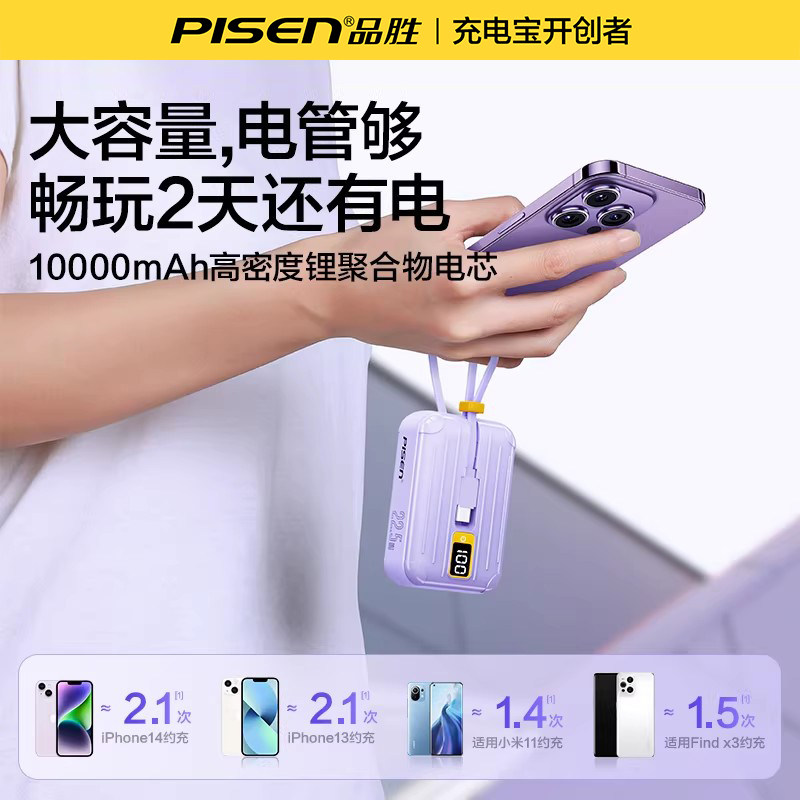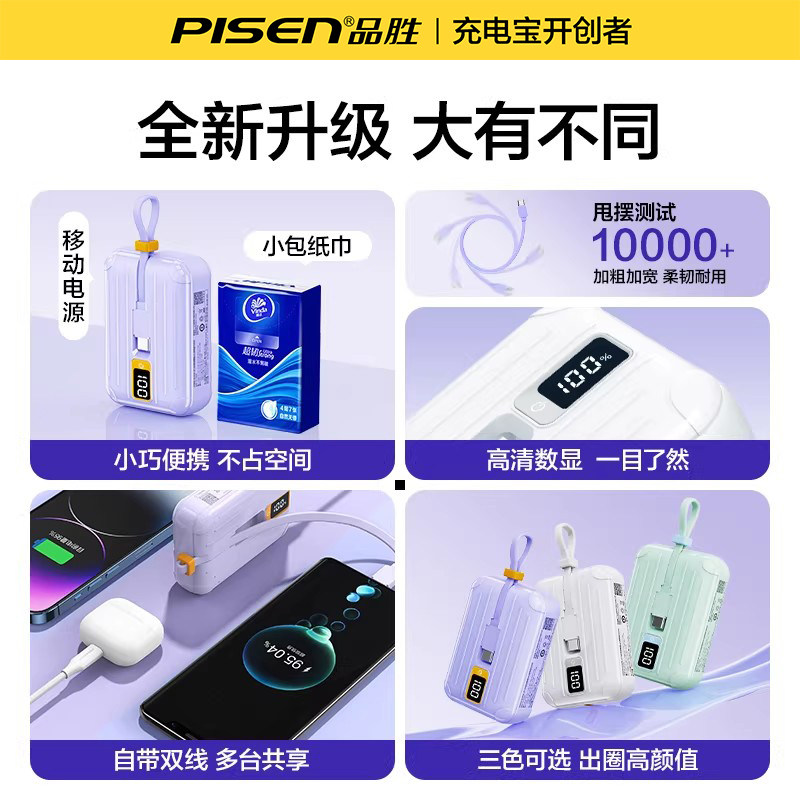 【3C认证充电宝】品胜自带插头20000毫安大容量10000充电器二合一电霸标识自带线适用苹果17小米移动电源