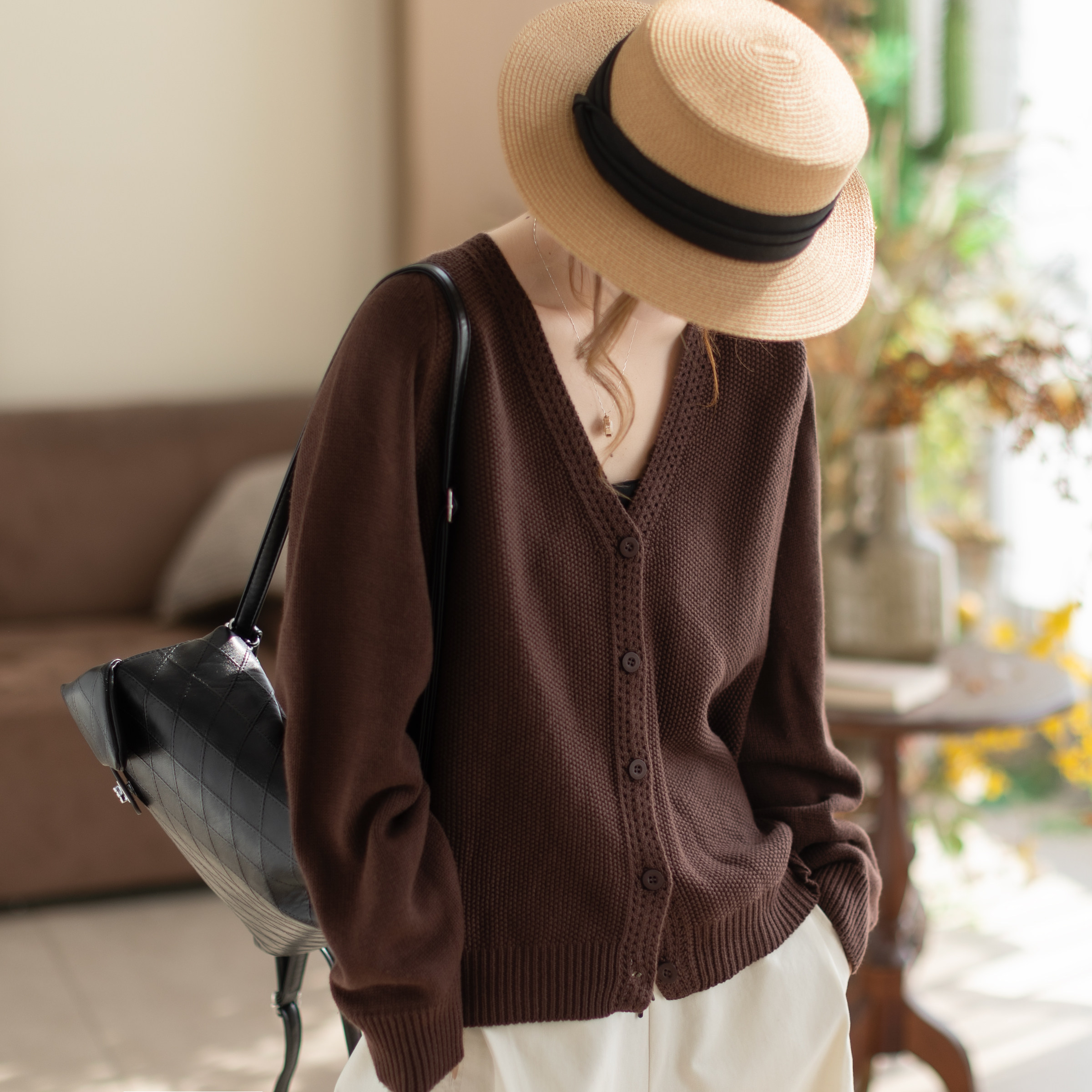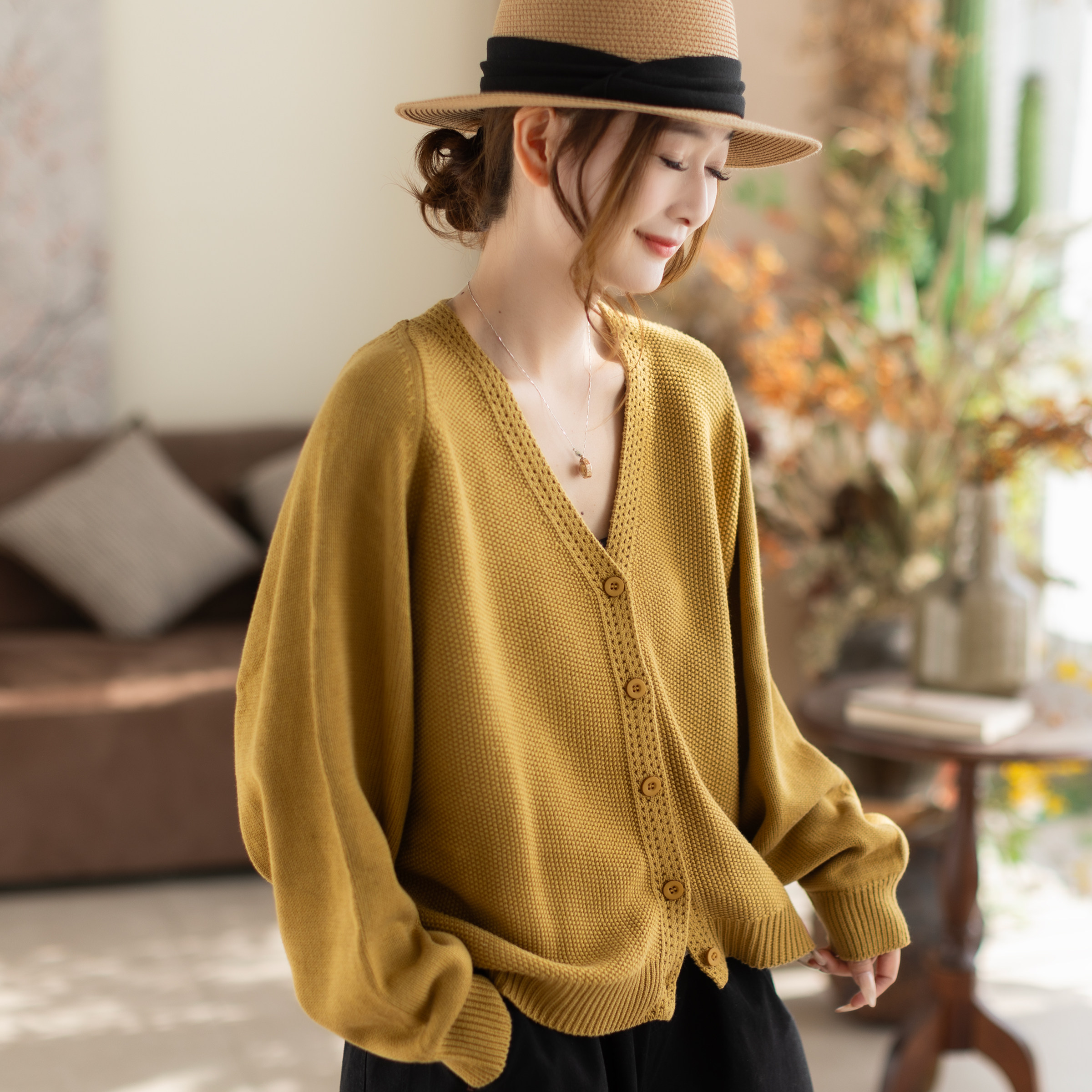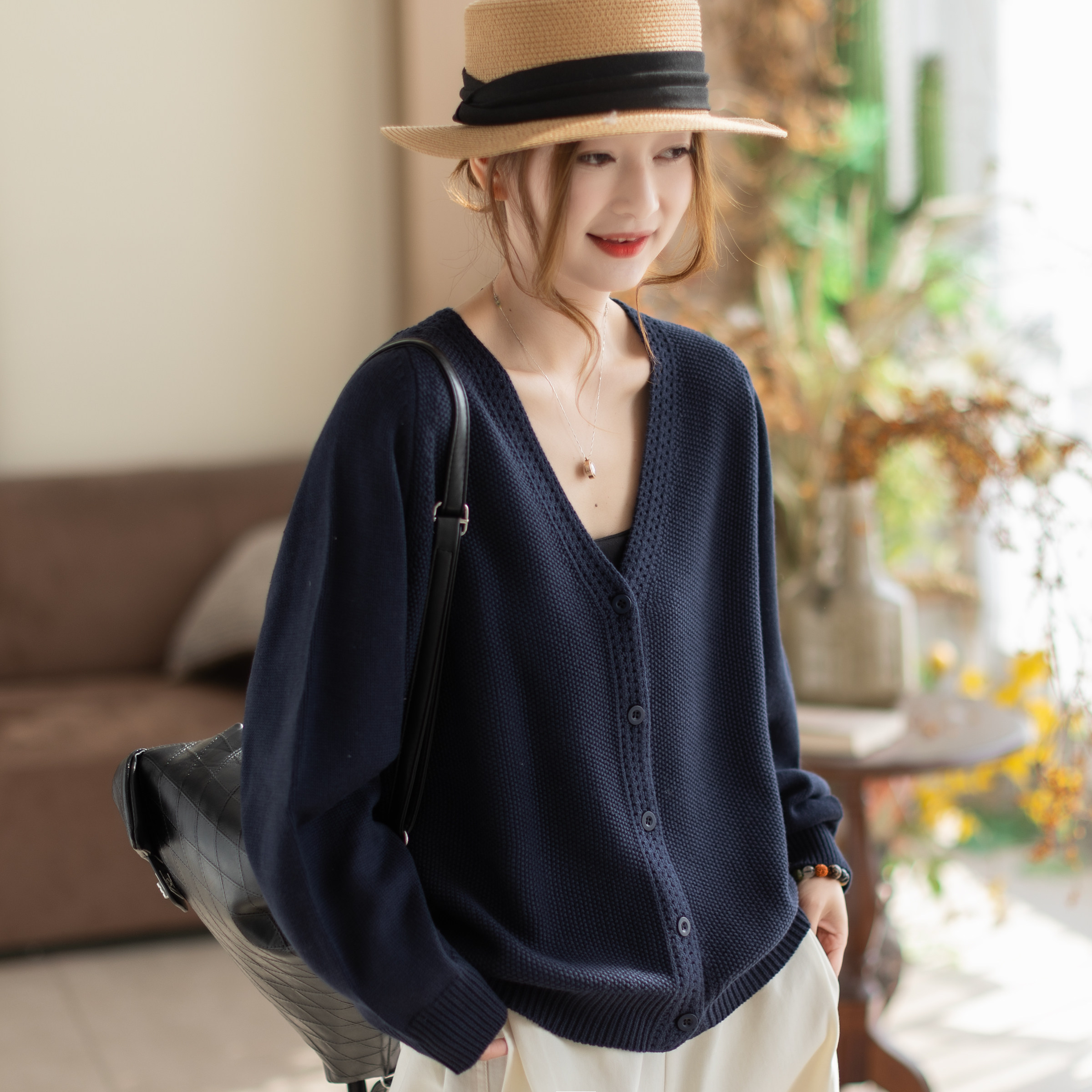 2026新款女装宽松针织开衫纯棉春秋外套纯色百搭圆领毛衣针织衫潮