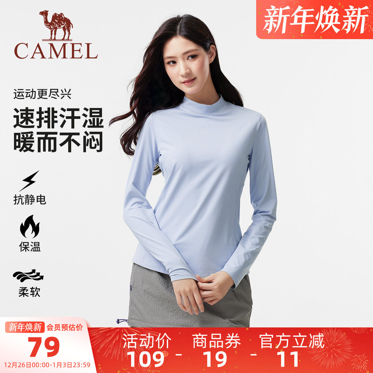 骆驼女装长袖T恤秋冬新款抗静电套头内搭外穿运动抓绒打底衫上衣