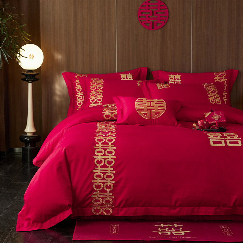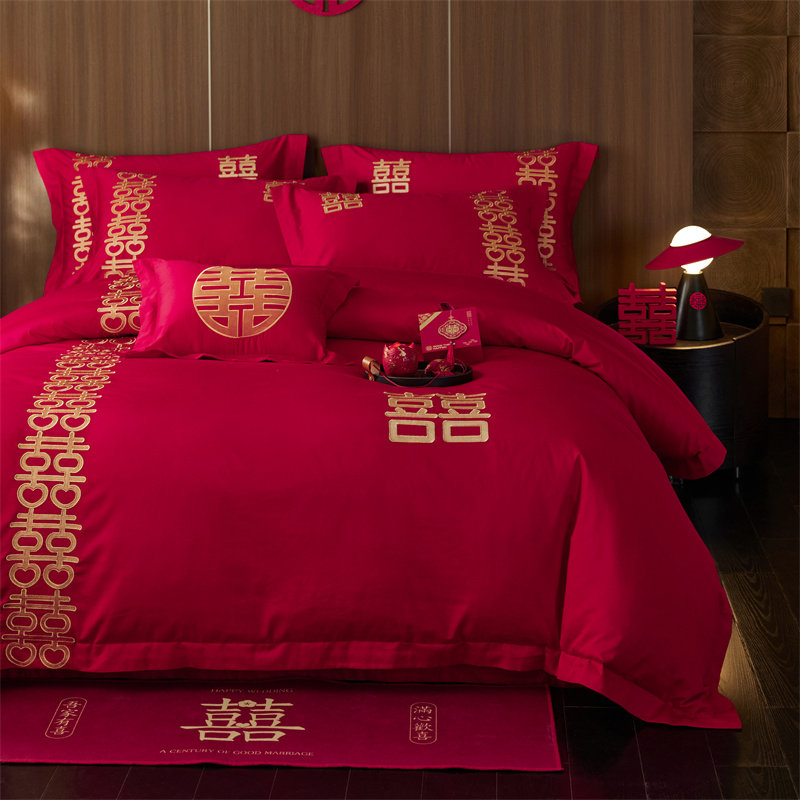 140支高端长绒棉婚庆四件套大红色纯棉全棉喜被刺绣中式结婚床品4