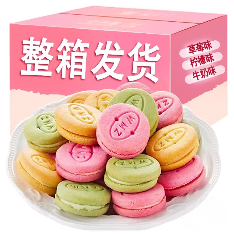 马卡龙夹心饼干整箱批发学生儿童小圆饼曲奇饼干草莓柠檬夹心酥性