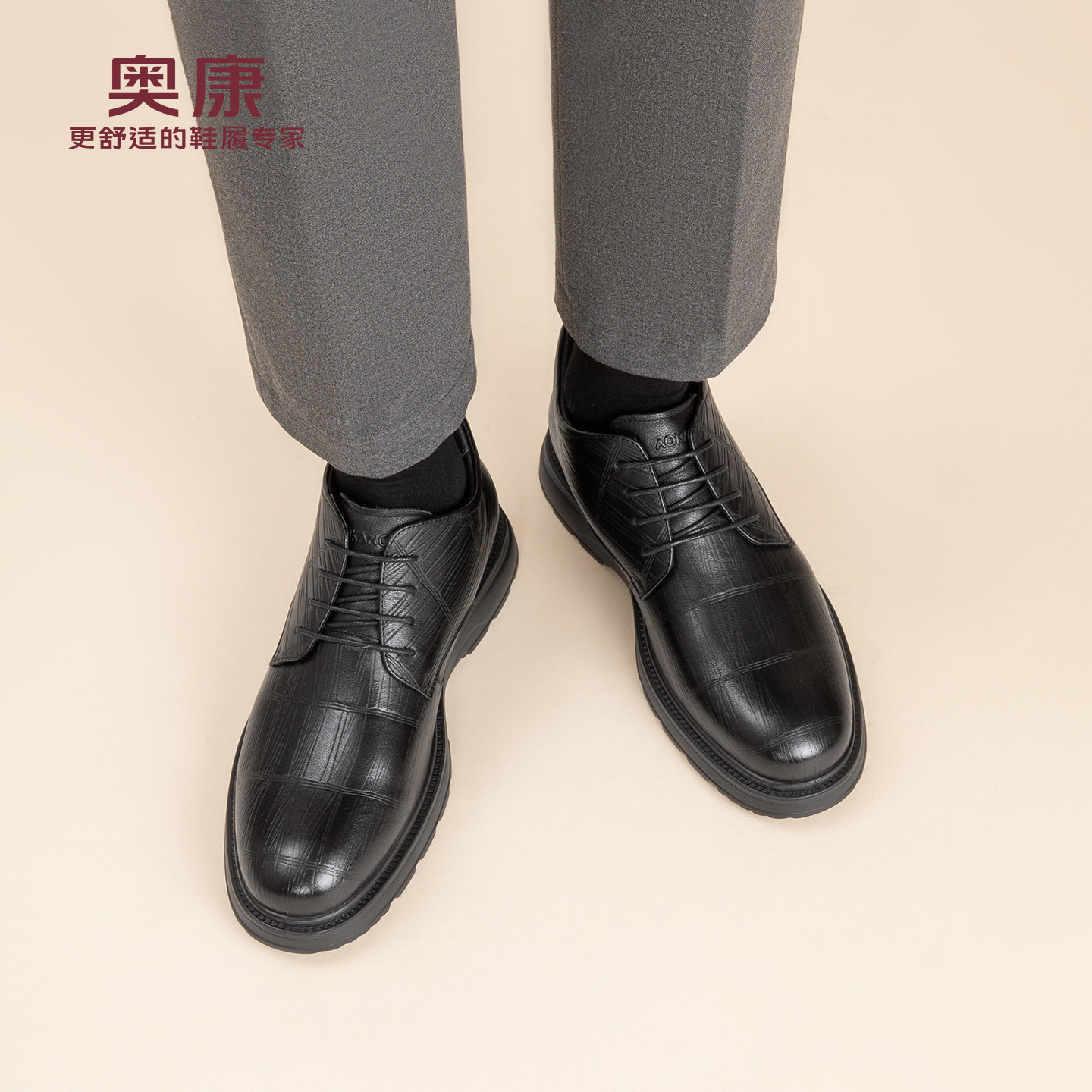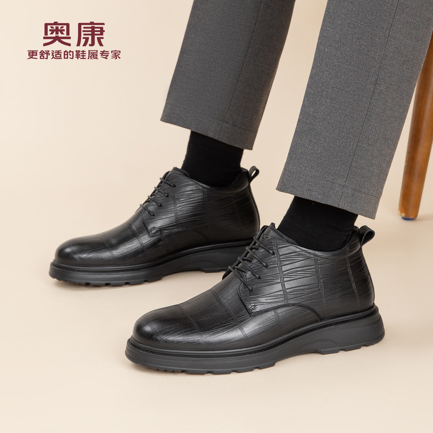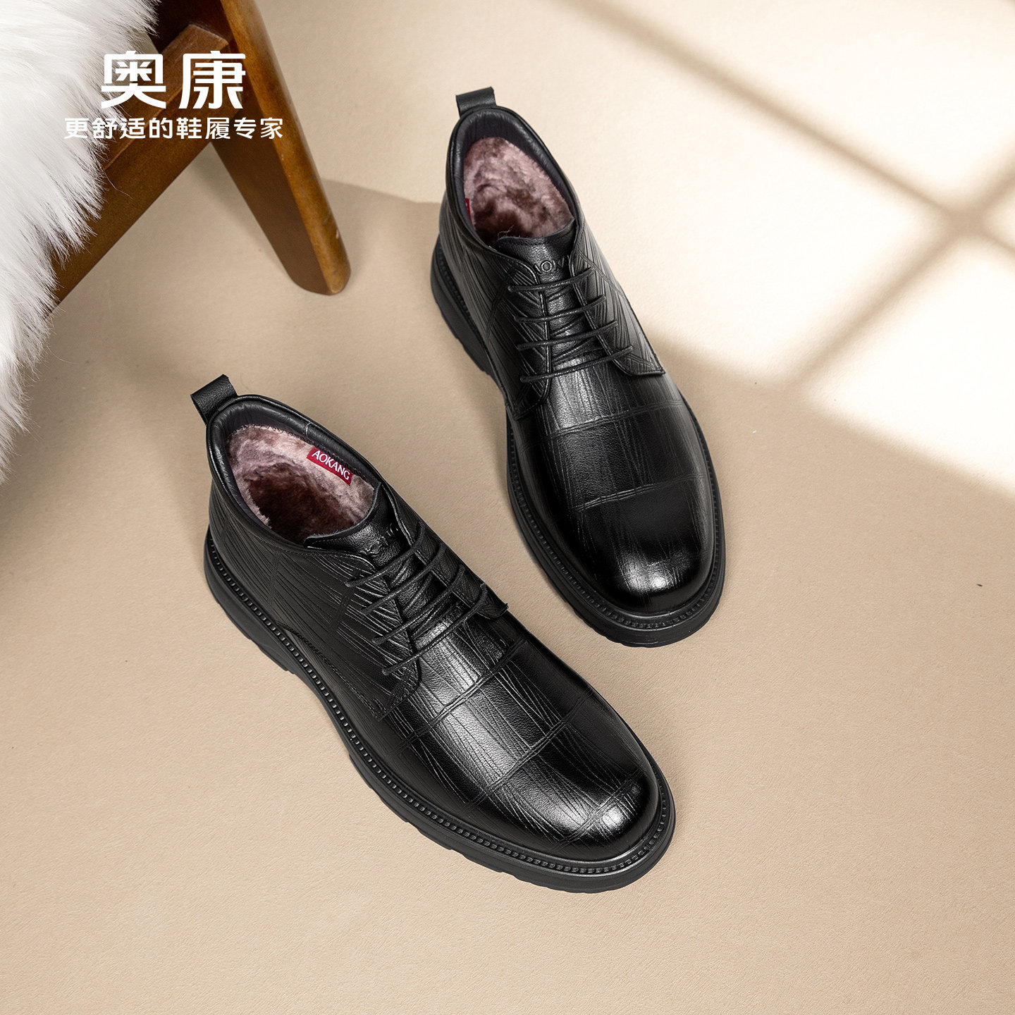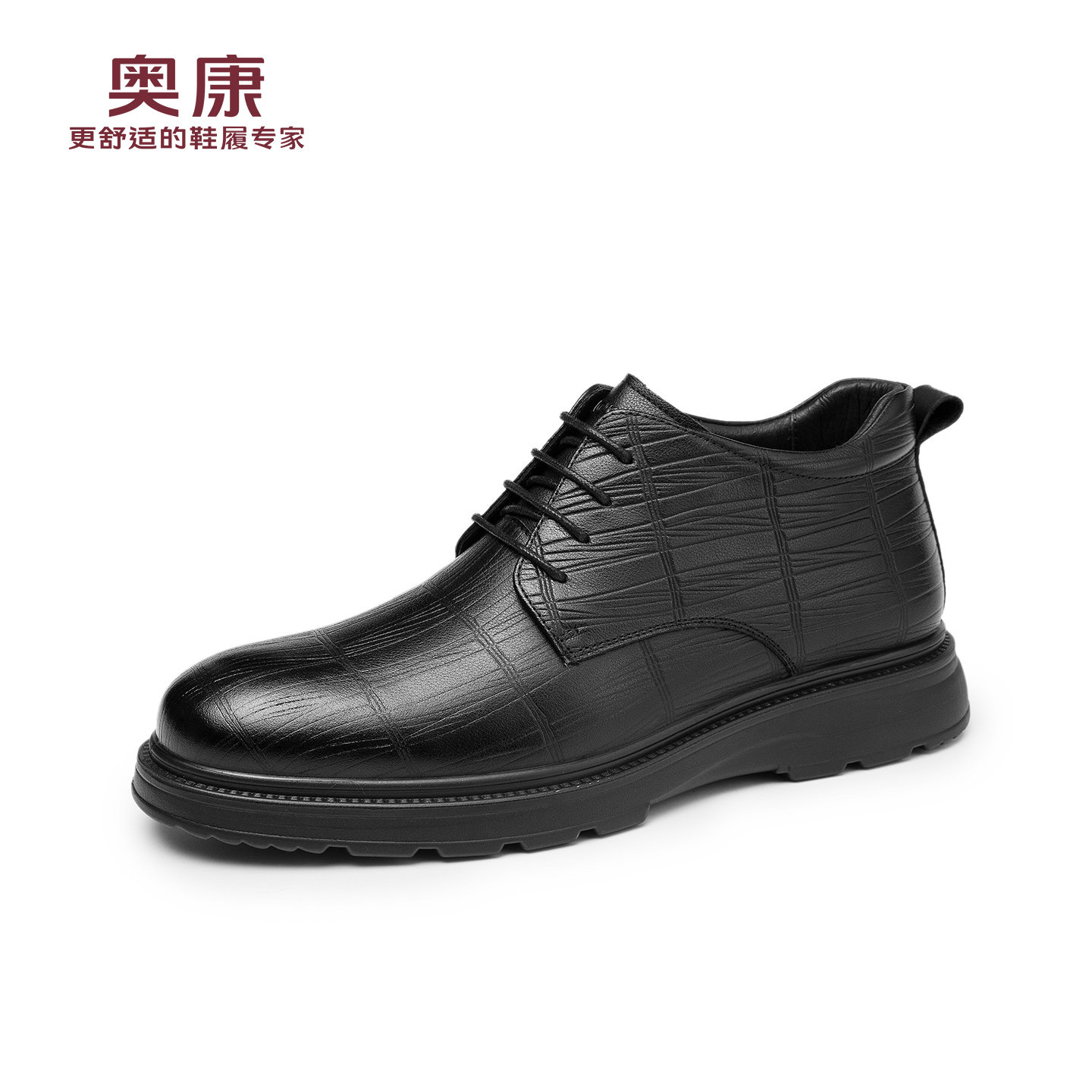 奥康 男鞋冬季新款真皮高帮棉鞋男士加绒保暖鞋压纹商务正装皮鞋N