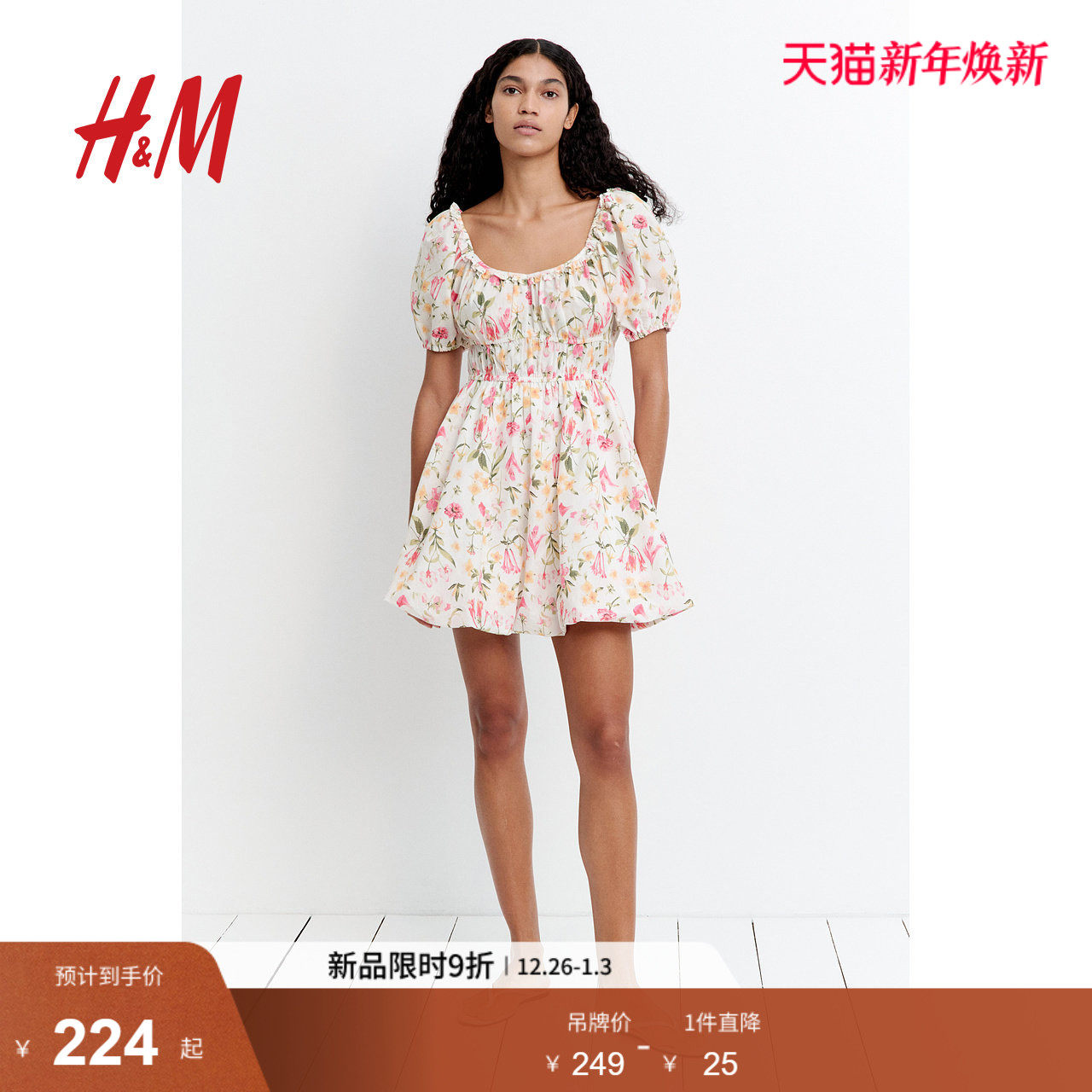 HM女装连衣裙2025冬季新款度假风泡泡袖设计感碎花连衣裙1280536