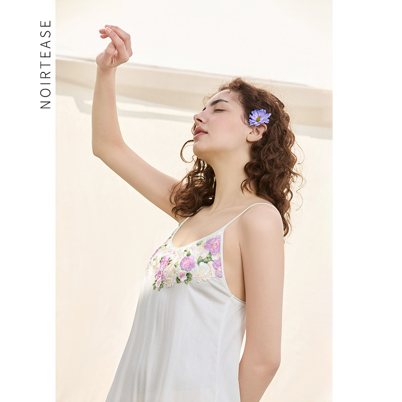 NoirTease夏季薄款性感蕾丝睡裙女士V领人棉修身中长款吊带睡衣裙