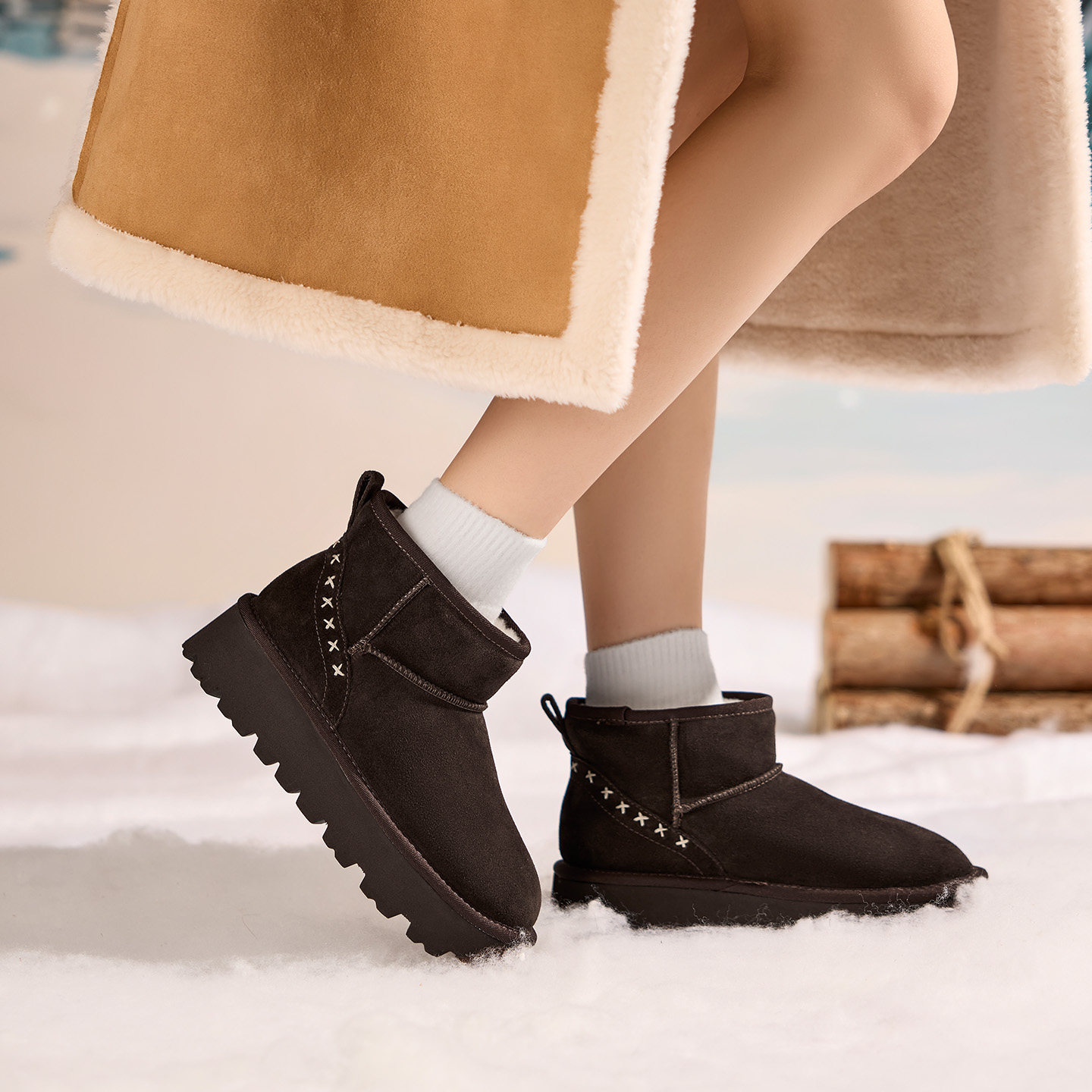 内增高~桑坡真皮厚底羊毛雪地靴女加绒保暖东北棉靴秋冬季短筒靴