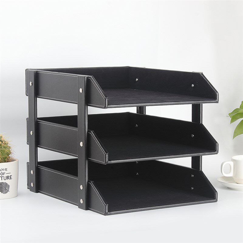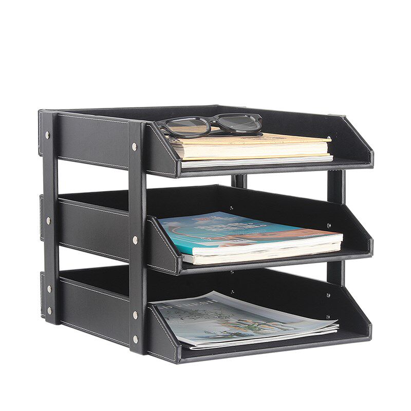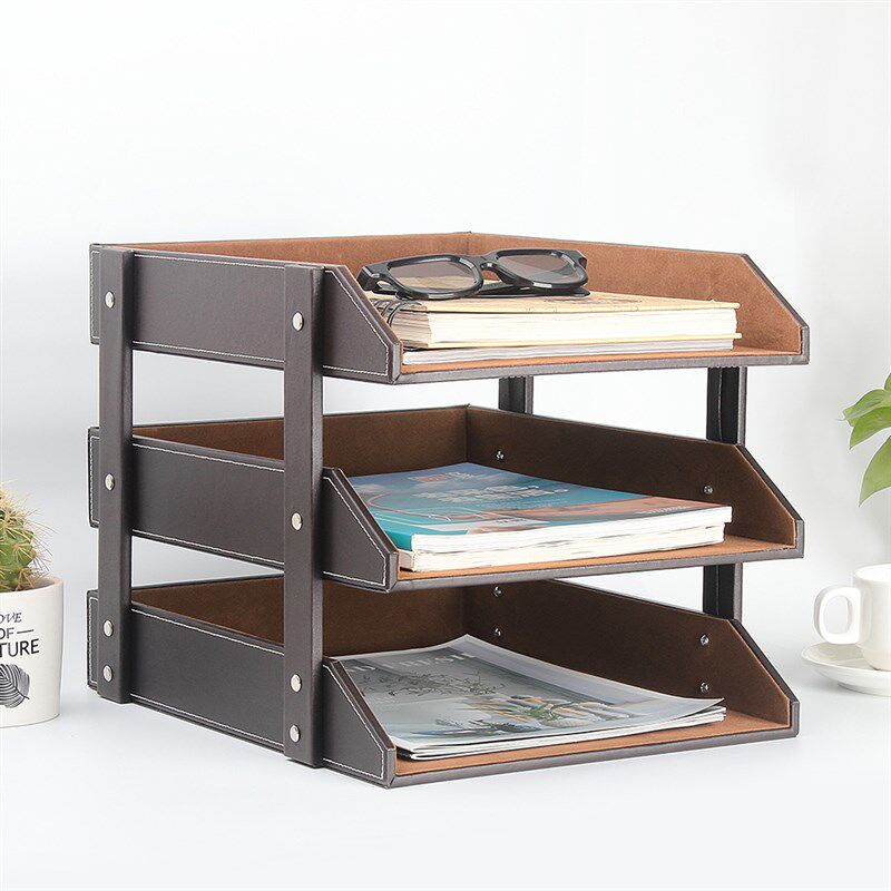皮质三层文件架文件栏桌面收纳整理文件盘商务资料架办公用品定制