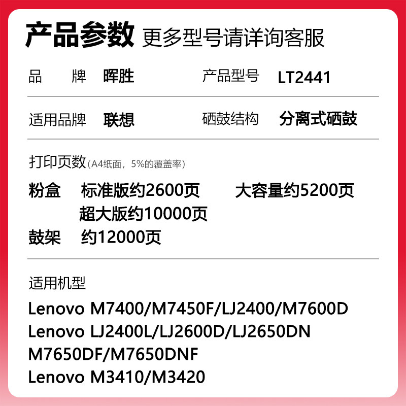 晖胜适用联想M7400硒鼓LT2441粉盒M7450f M7650df/dnf Lj2400L墨盒M7600d打印机碳粉盒Lj2600d 2650dn墨粉仓