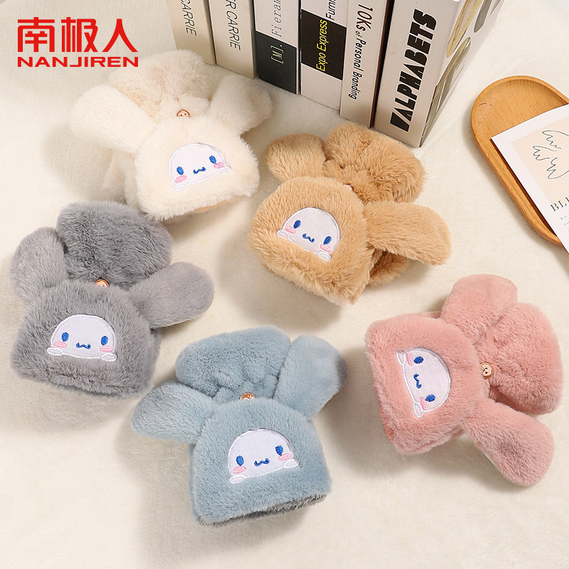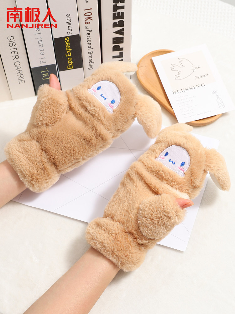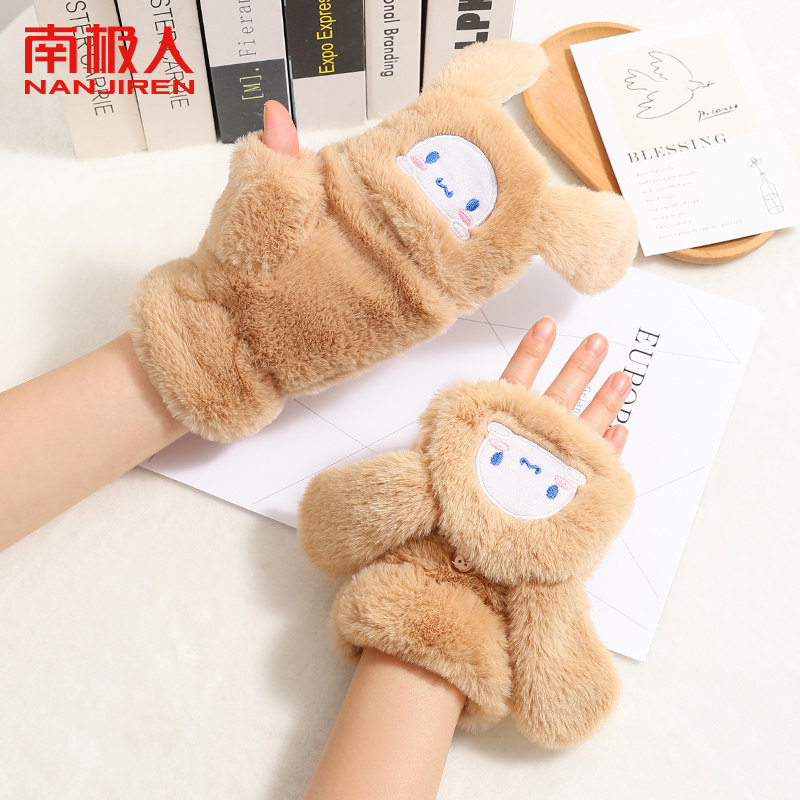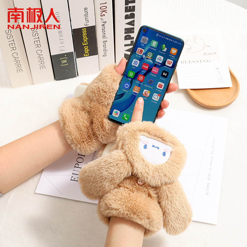 南极人保暖手套女冬季加绒加厚防寒触屏半指手套可翻盖骑行手套H