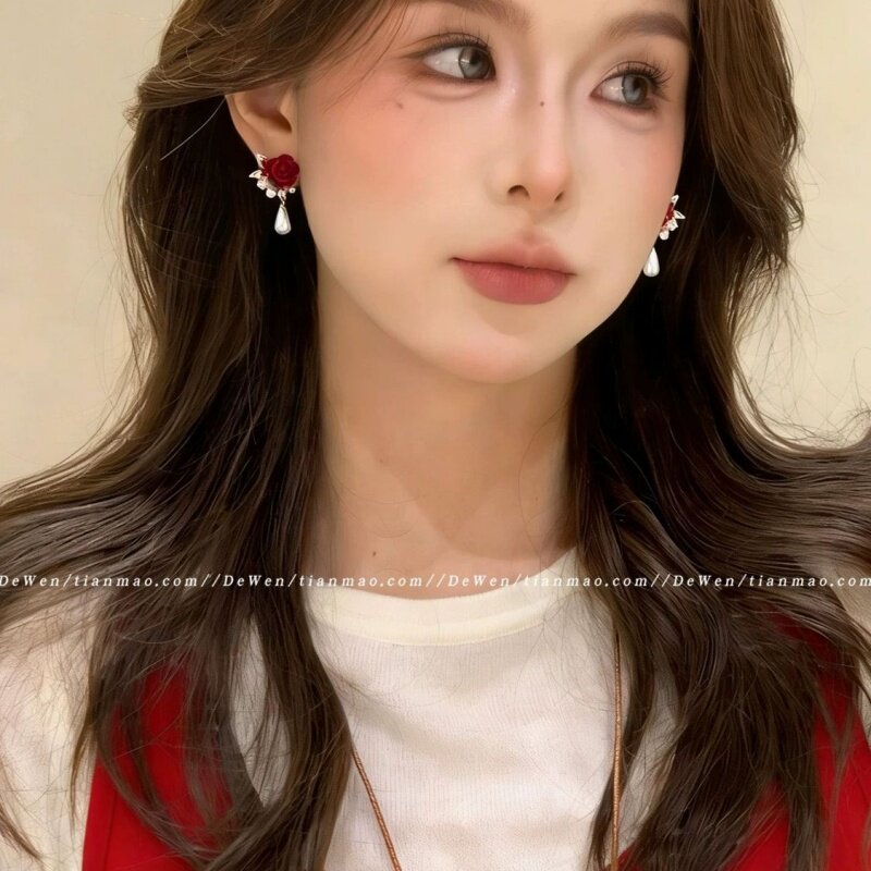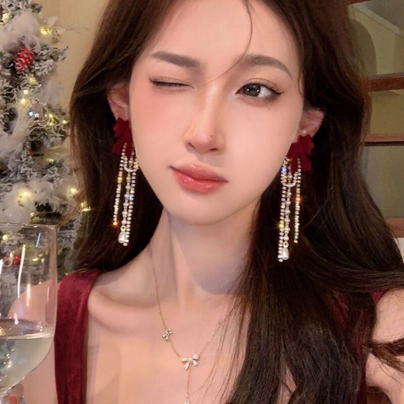 酒红色植绒蝴蝶结珍珠流苏耳夹适合秋冬复古气质港风珍珠耳坠耳饰