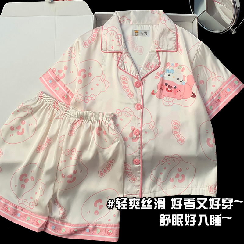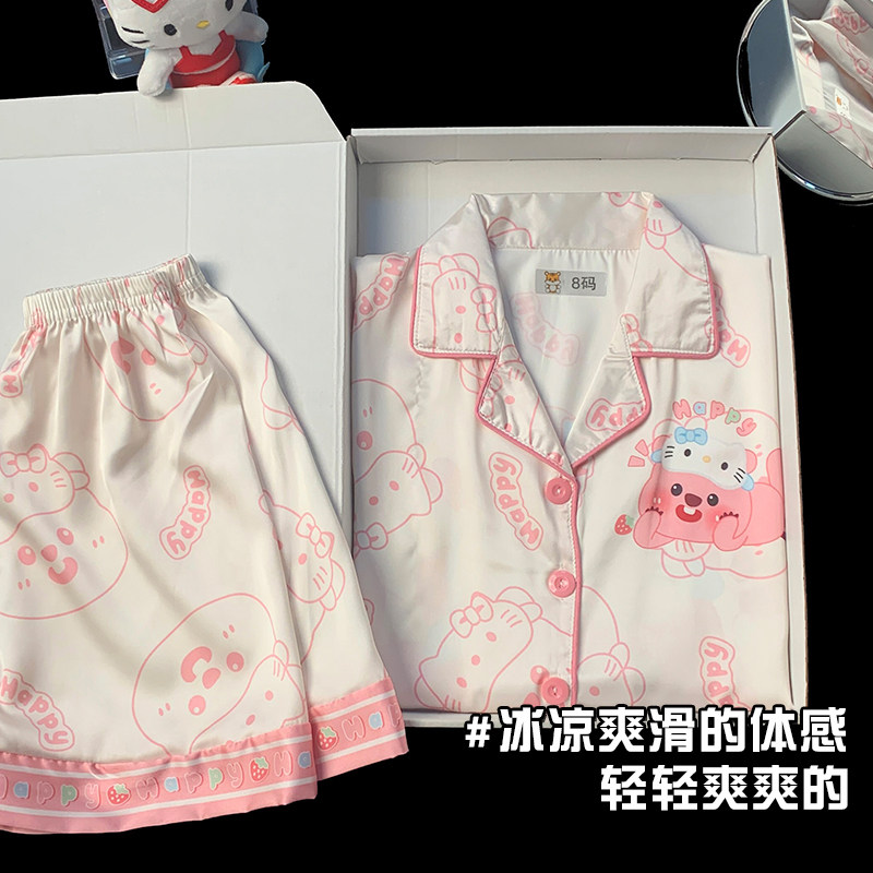 儿童女童冰丝睡衣卡通海狸小女孩夏季薄款2025新款短袖短裤家居服