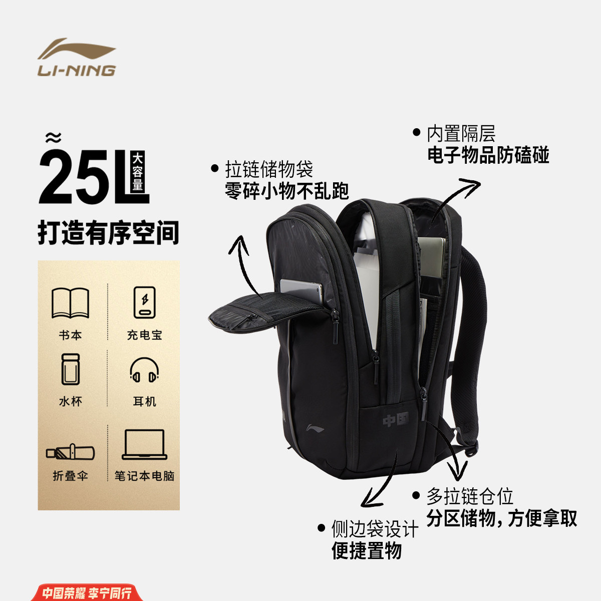 李宁荣耀系列双肩包男包女包2026新款官方正品背包学生书包运动包