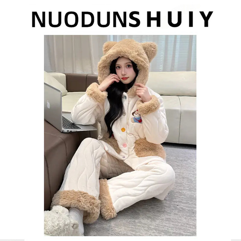 珊瑚绒睡衣女冬季卡通三层夹棉加厚保暖学生冬天可外穿家居服外出