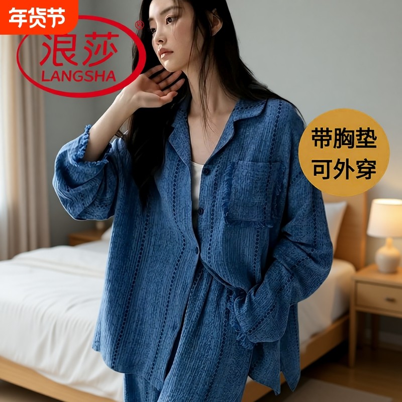 浪莎2025新款带胸垫睡衣女春秋季纯棉长袖长裤韩式家居服薄款套装