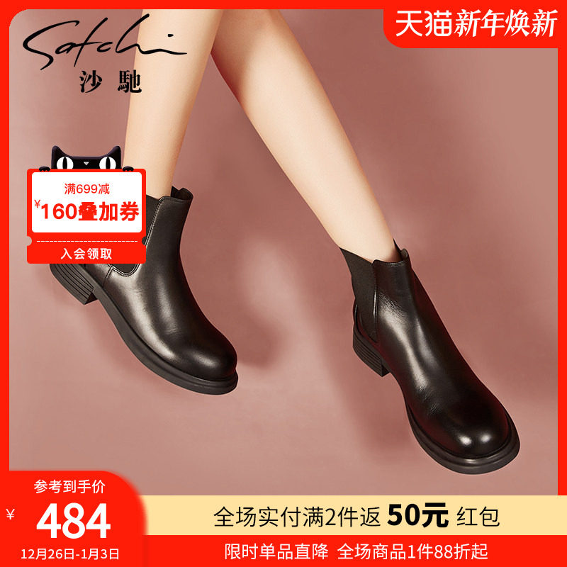 沙驰真皮切尔西靴女秋冬新款黑色粗跟中跟圆头短靴大头靴子裸靴子