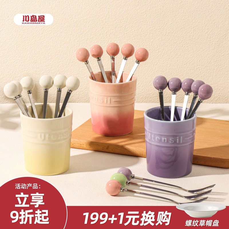 川岛屋水果叉子套装家用甜品小叉子收纳罐不锈钢水果签果插高级感
