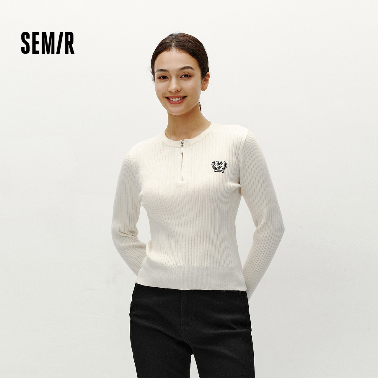 森马毛衣女冬季短款半开襟刺绣修身套头衫女生休闲简约风显瘦上衣