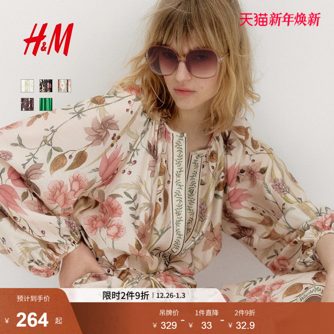 HM女装连衣裙2025新款缎面大摆裙插肩袖灯笼袖A字连身裙1299908