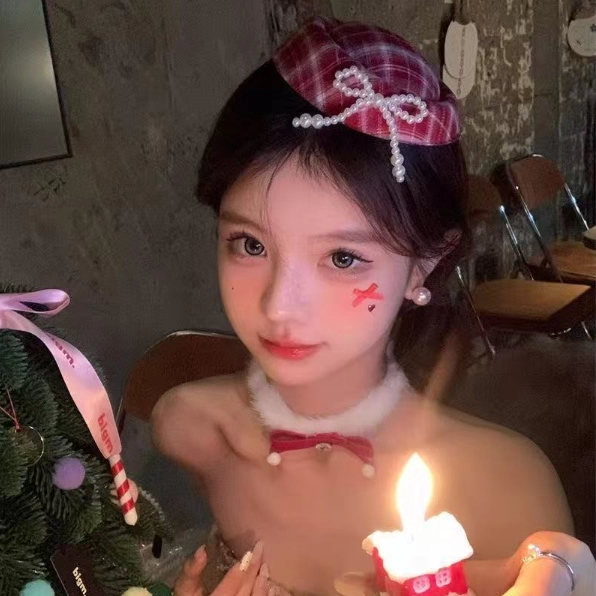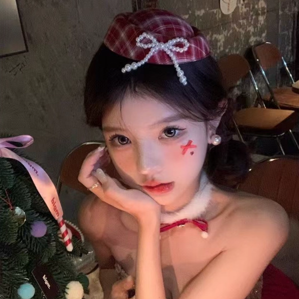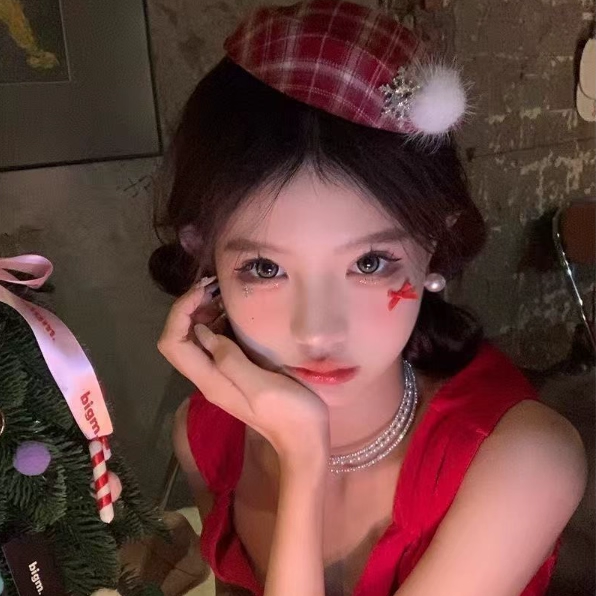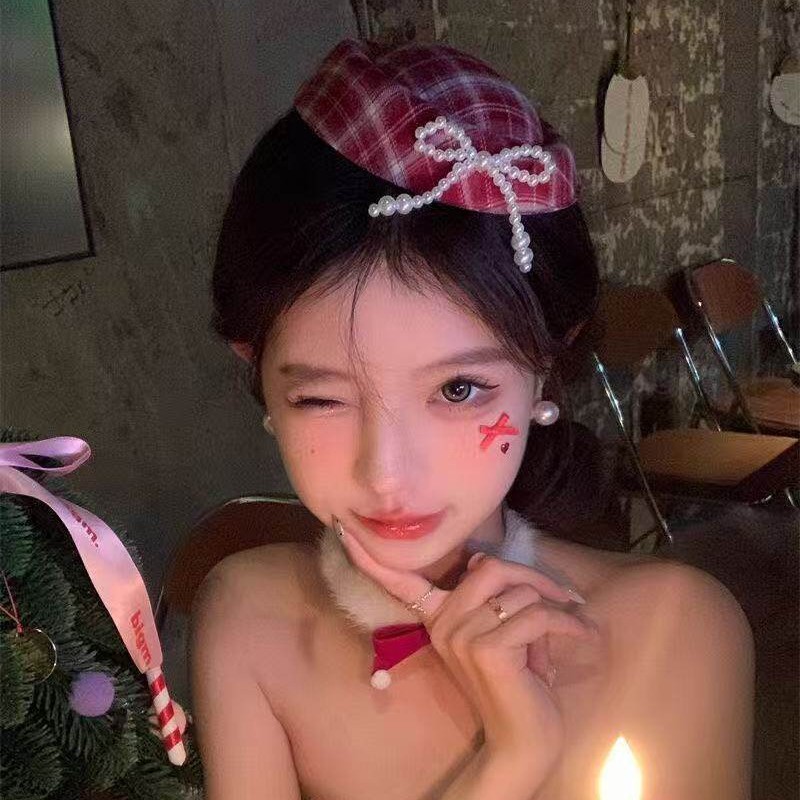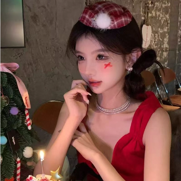 氛围甜美红格圣诞水貂雪花毛球礼帽发夹贝雷帽发饰少女心头拍照女