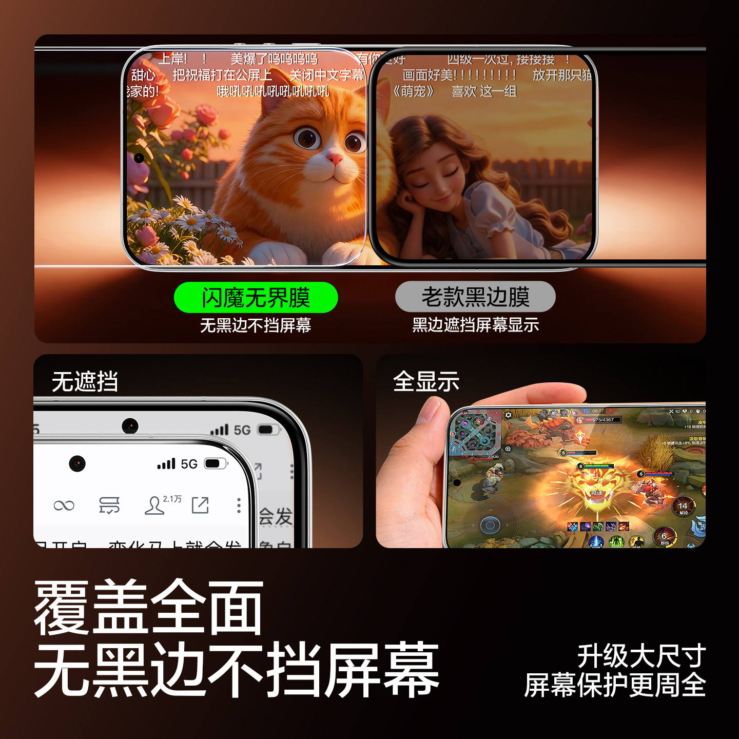 闪魔小魔盒适用iPhone16ProMax钢化膜16e苹果15pro无黑边13 promax无尘仓屏幕14plus全屏覆盖12手机保护贴膜
