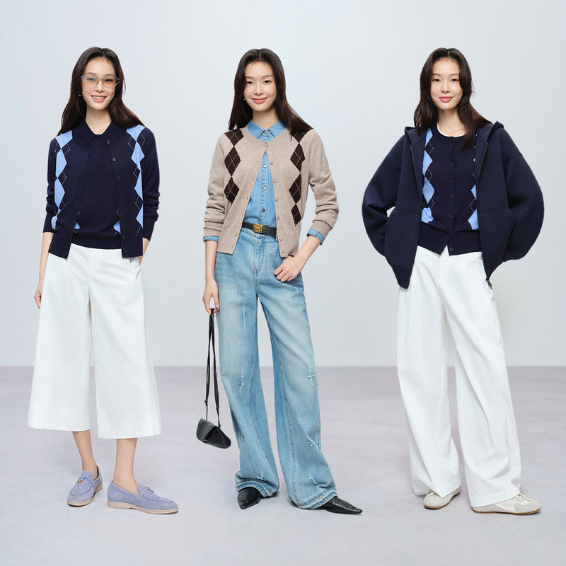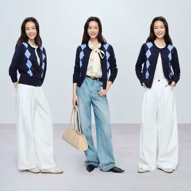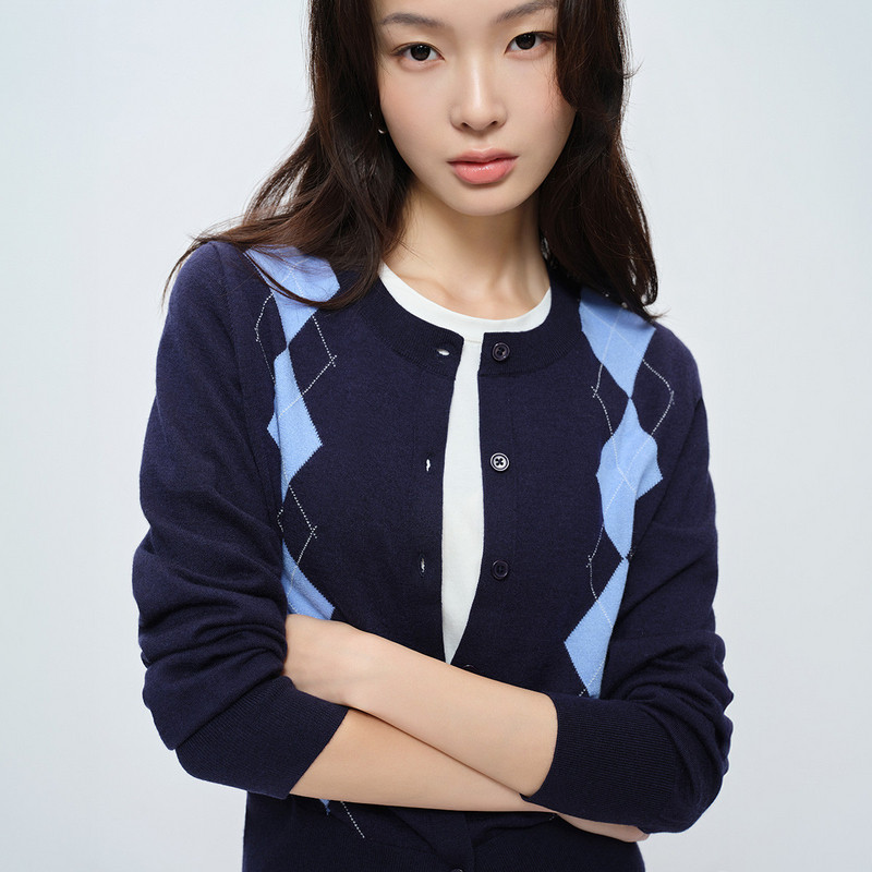 【可机洗】抗起球撞色菱格纹开衫naivee纳薇26春新款羊毛混纺针织