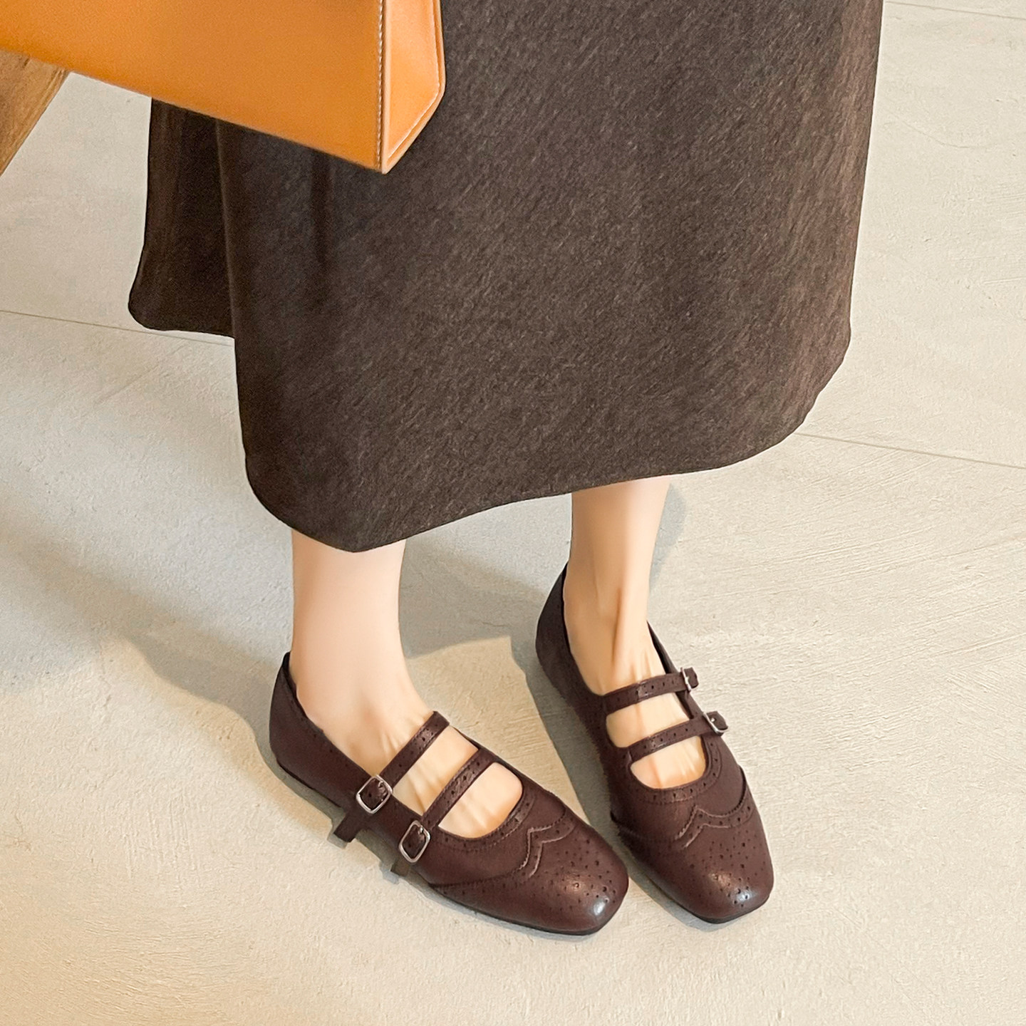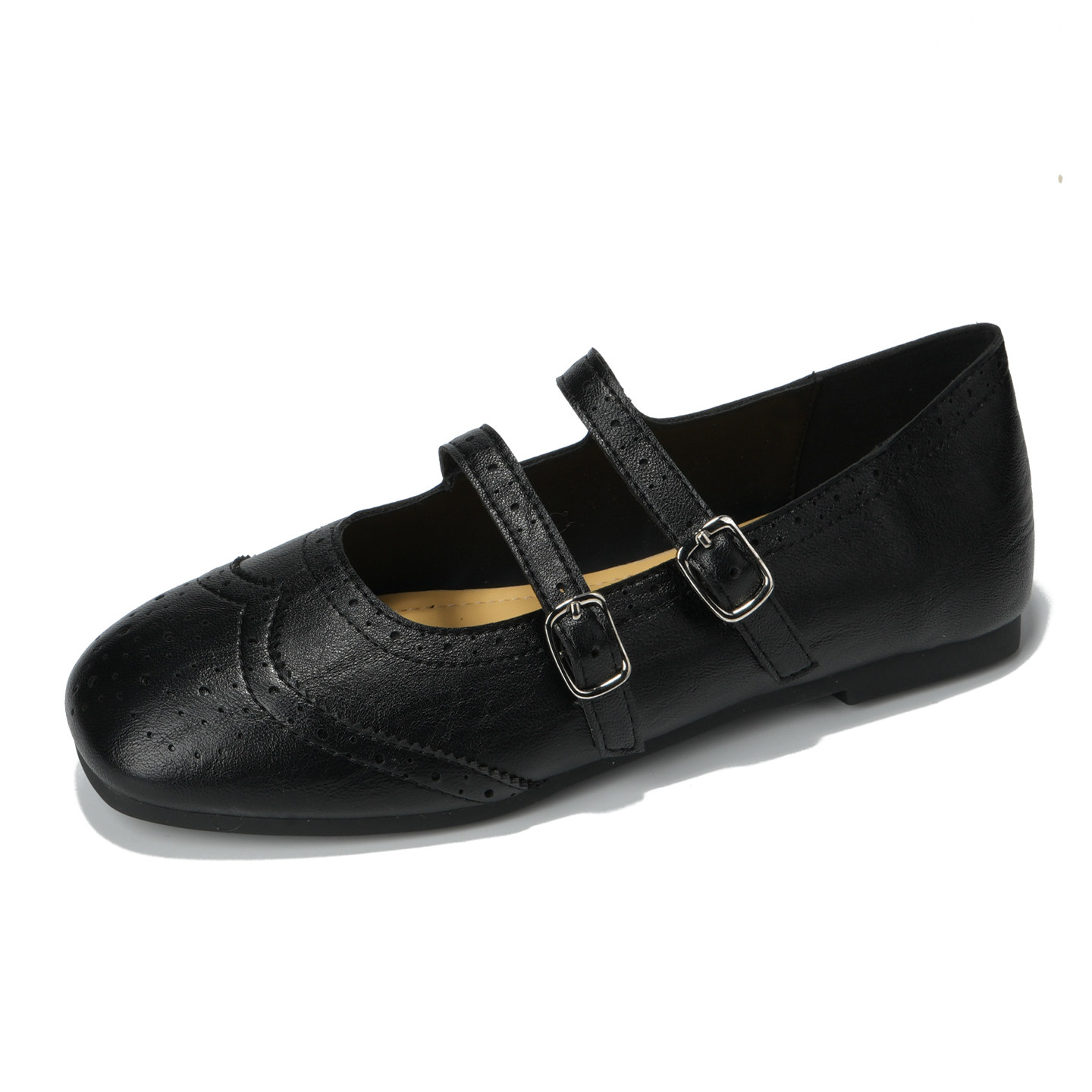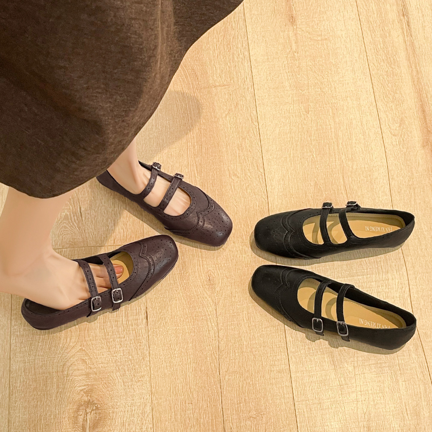 羊皮版~法式双扣带玛丽珍鞋女2026新款绝美雕花平底单鞋大码女鞋