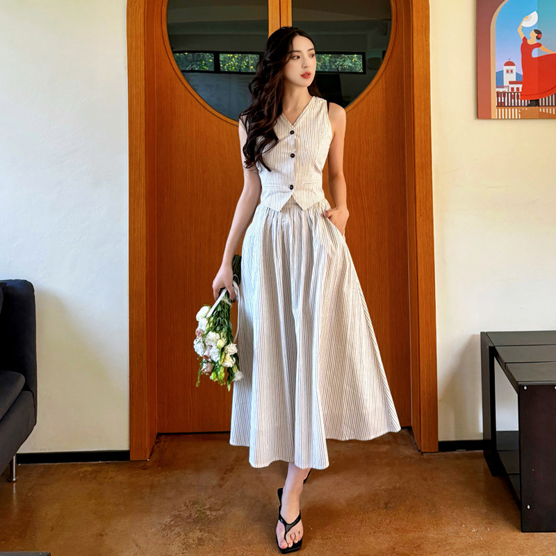 JUJU定制法式休闲马甲上衣文艺复古口袋裙度假套装裙半身裙女夏季