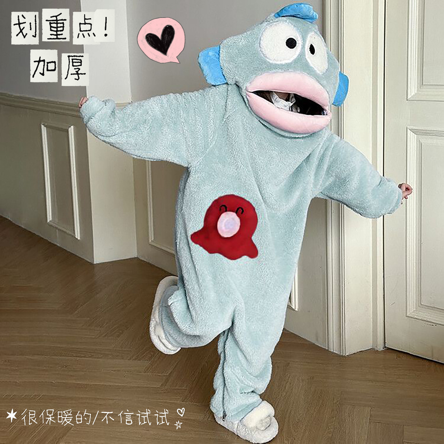 加绒加厚丑鱼儿童可爱搞怪连体睡衣男女亲子秋冬珊瑚绒卡通家居服