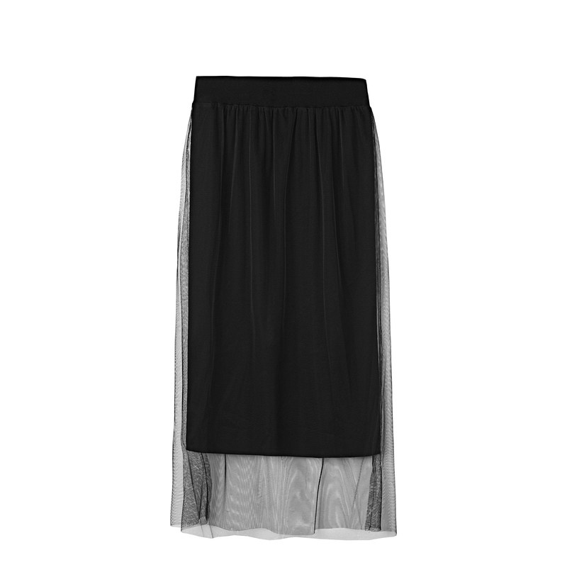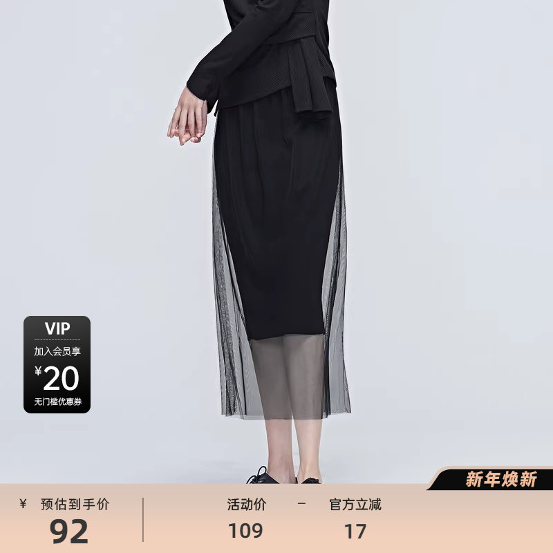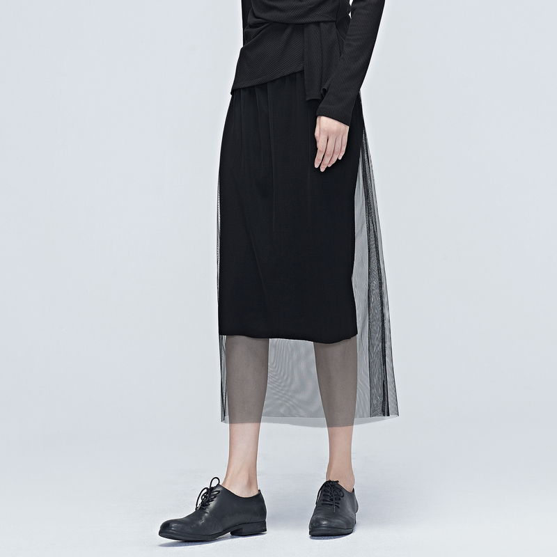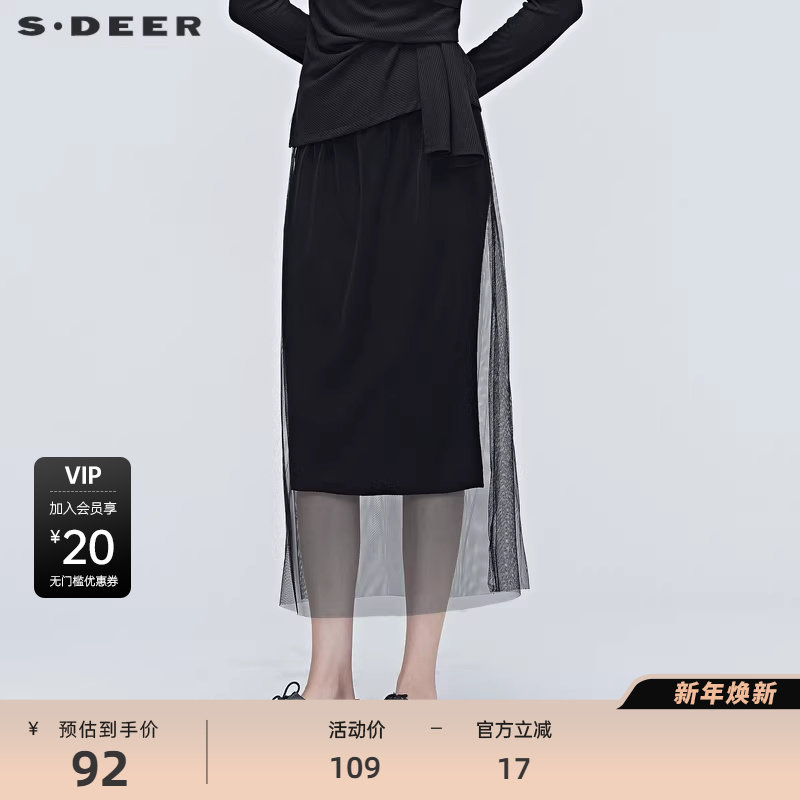 【秒杀】sdeer圣迪奥秋季半身长裙秋黑色网纱拼接纱裙子S20381101