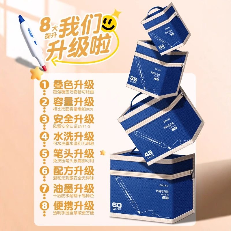 得力丙烯马克笔不透色可叠色丙烯笔24色48色学生美术专用防水diy人体面部彩绘涂鸦笔60色无毒可水洗水性彩笔