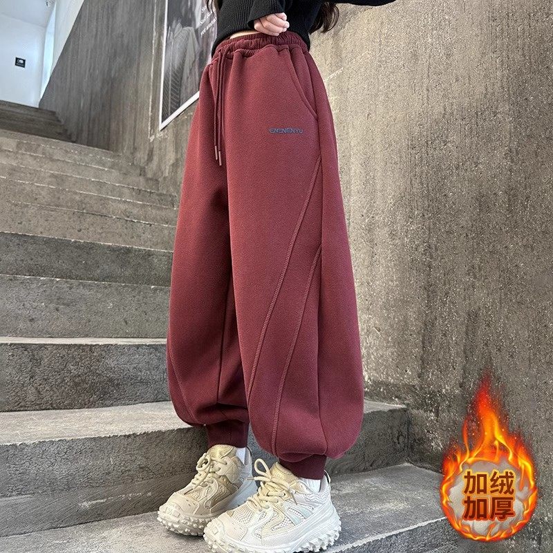 女童加绒裤子秋冬季中大童运动裤女孩洋气外穿宽松一体绒休闲长裤