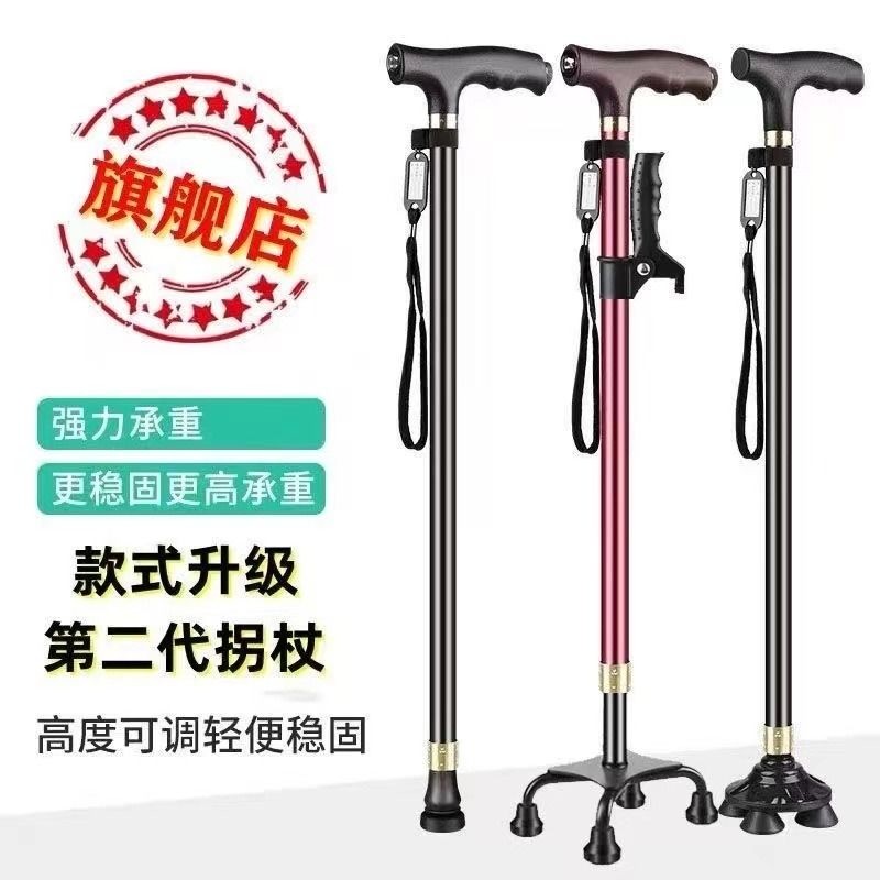 老人拐杖老年人专用拐棍四脚轻便手杖防摔倒拐棒四角伸缩防滑带灯