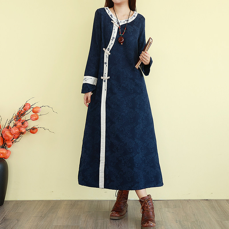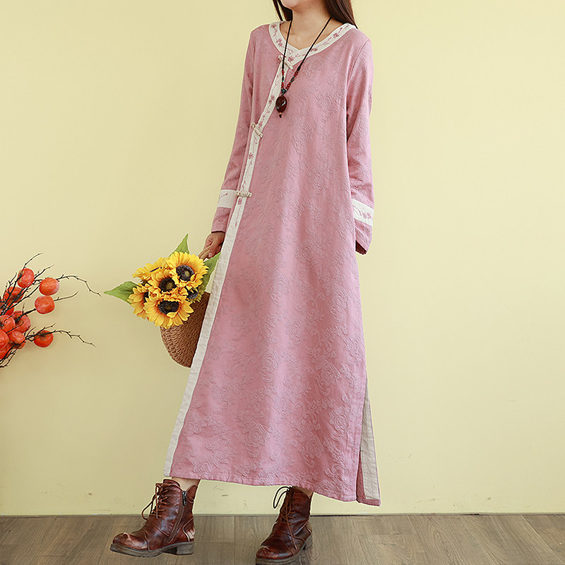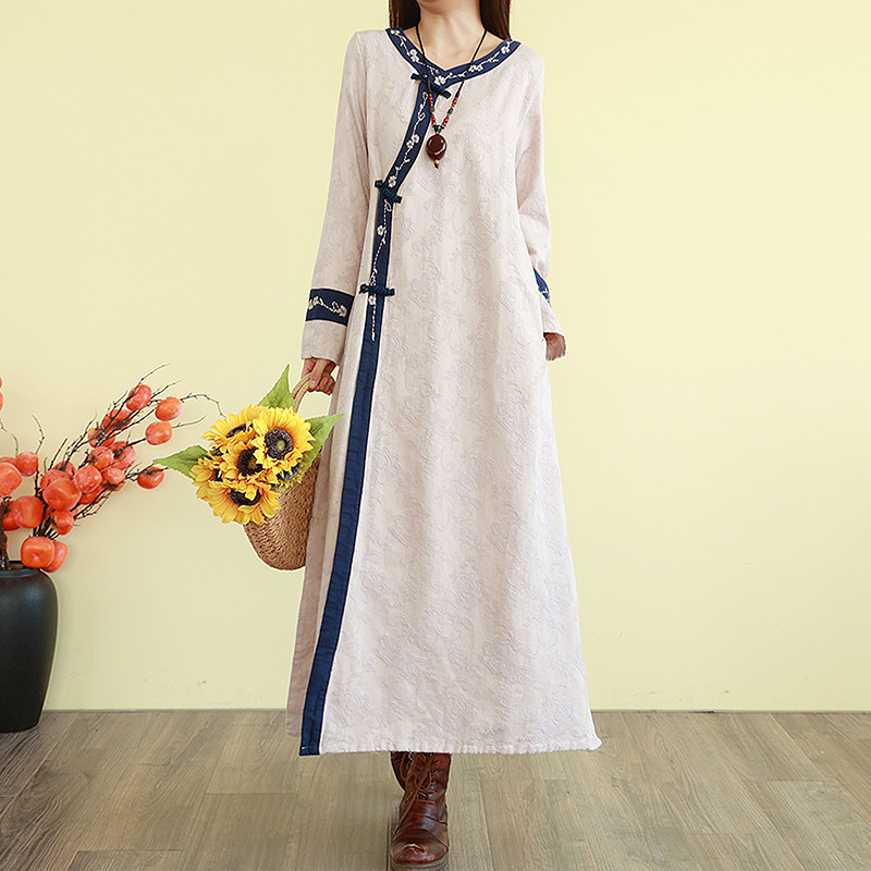 复古民族风亚麻提花刺绣连衣裙女V领秋季改良旗袍裙长款宽松裙子