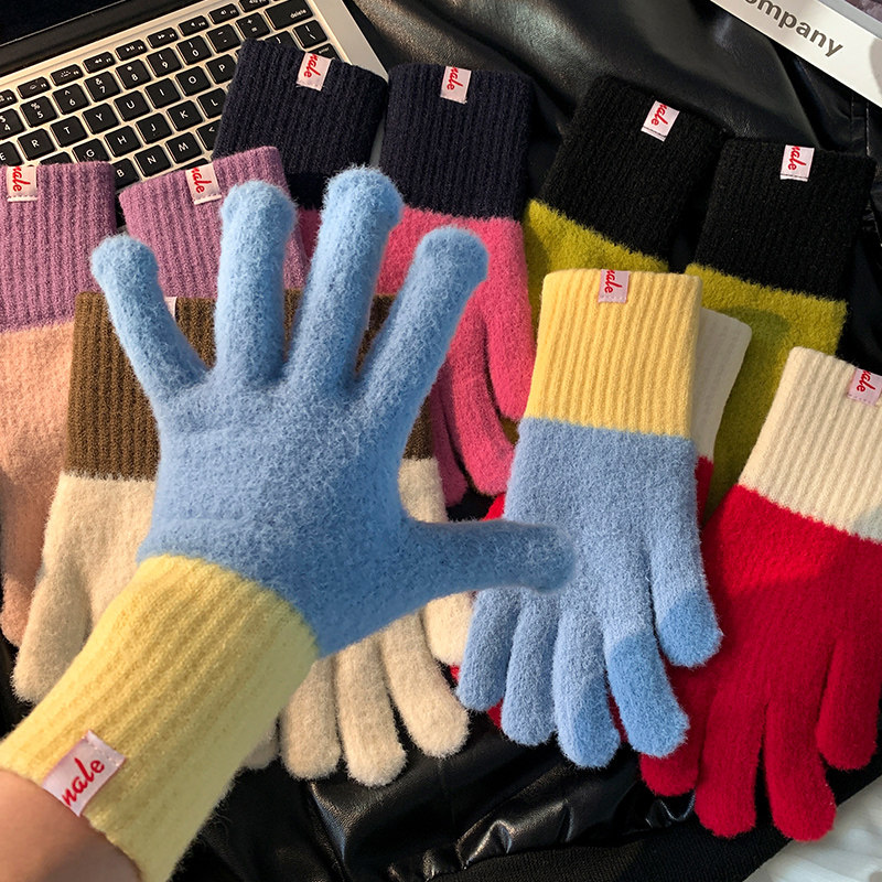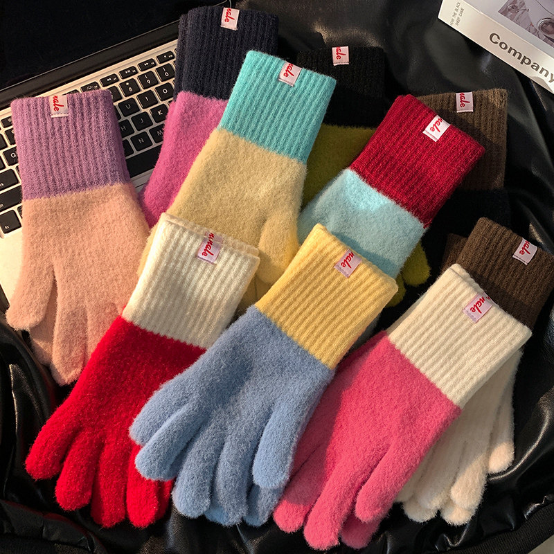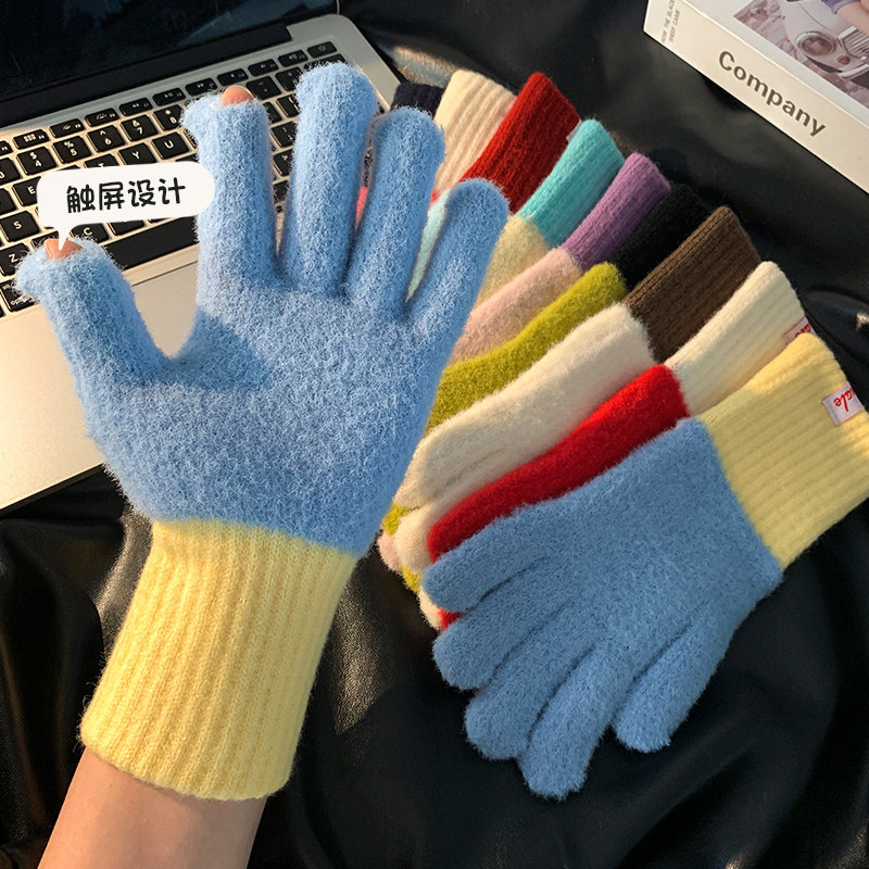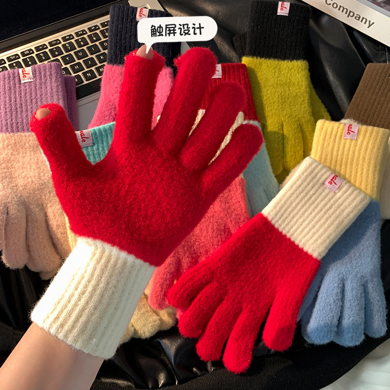 毛线针织手套女冬季保暖时尚加厚学生拼接分指露指分指手套