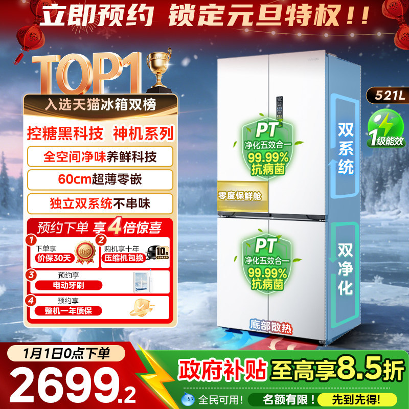 容声520L十字对开四门一级能效家用电冰箱超薄嵌入以旧换新补贴