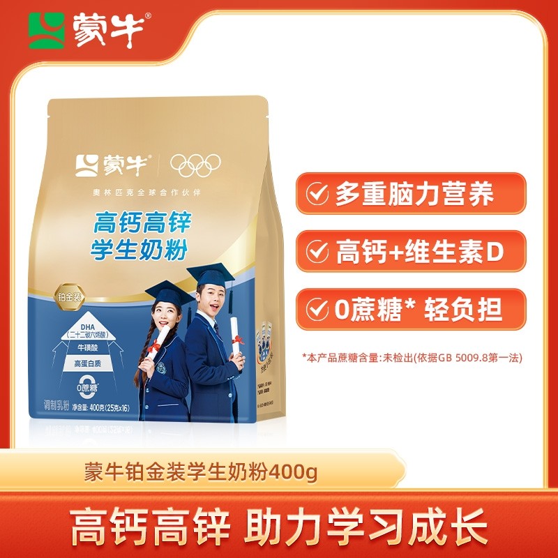 蒙牛铂金装学生奶粉400g 高钙高锌青少年男女早餐冲饮牛奶粉袋装