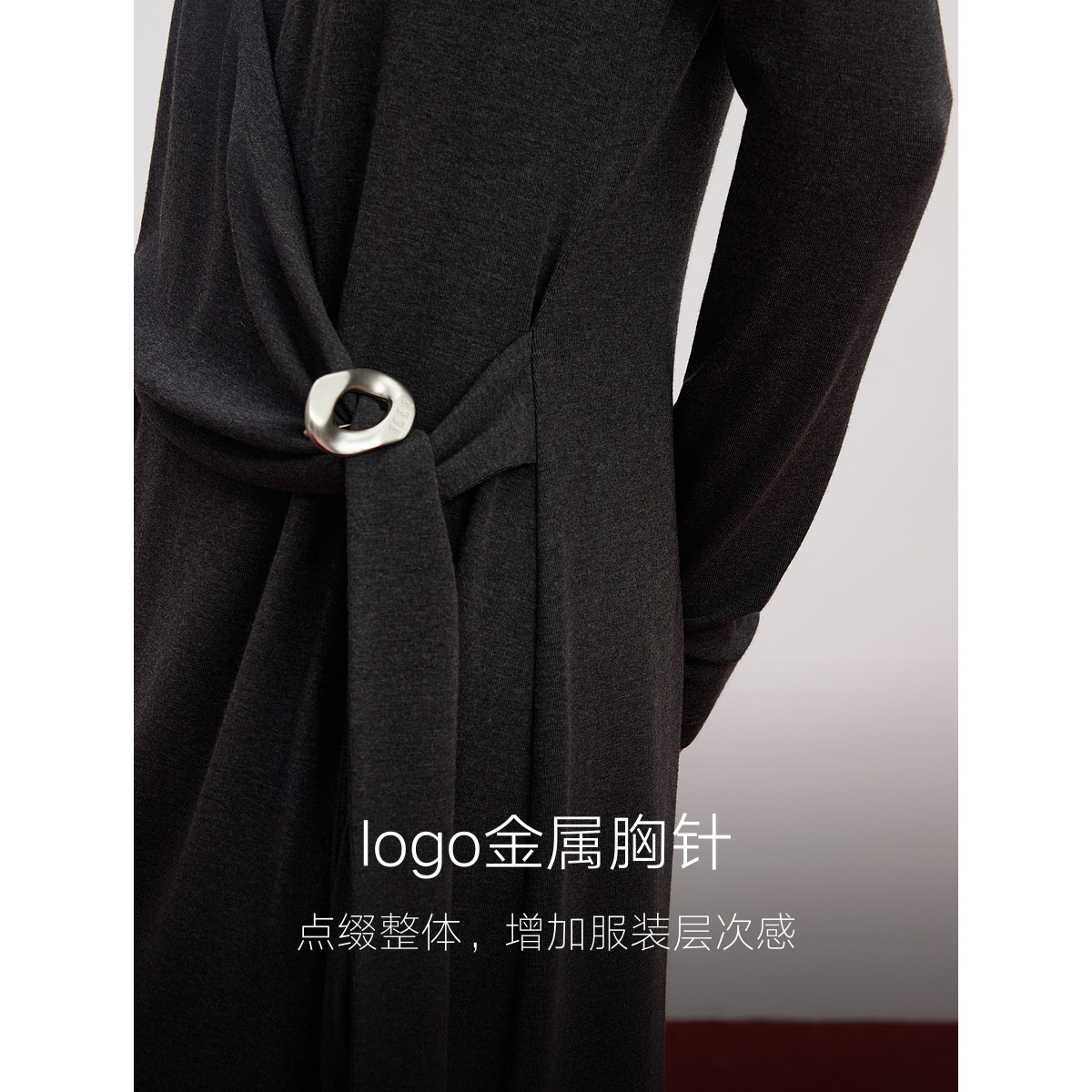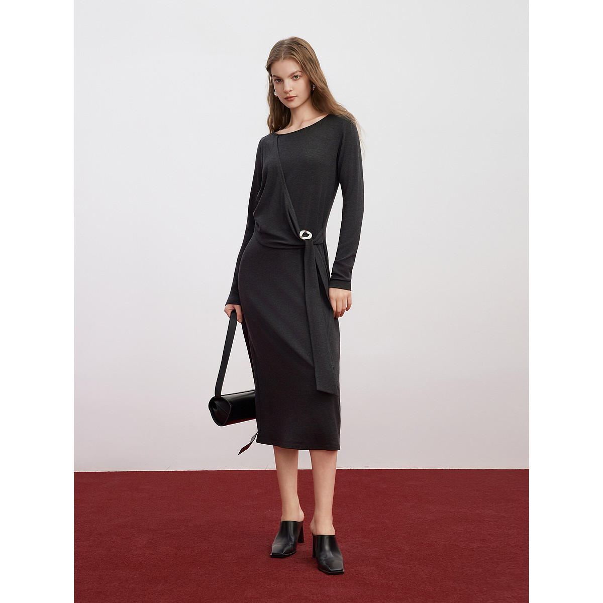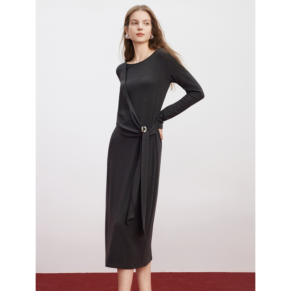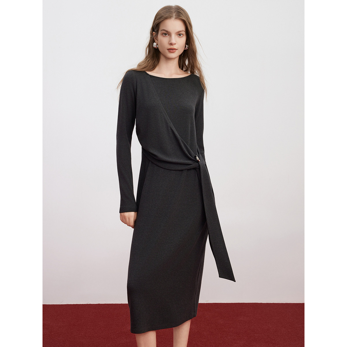 ELLE法式一字领扭结长袖连衣裙女2025秋季新款不规则优雅收腰长裙