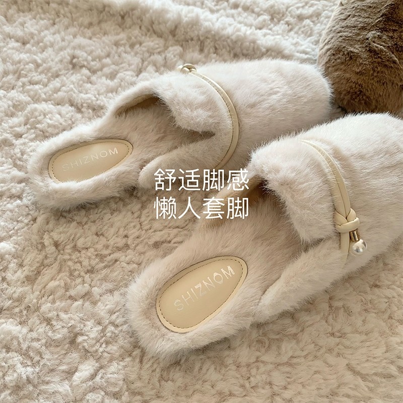 野貂~INS法式气质仙女风毛毛拖鞋女冬外穿加绒棉拖鞋包头半拖平底