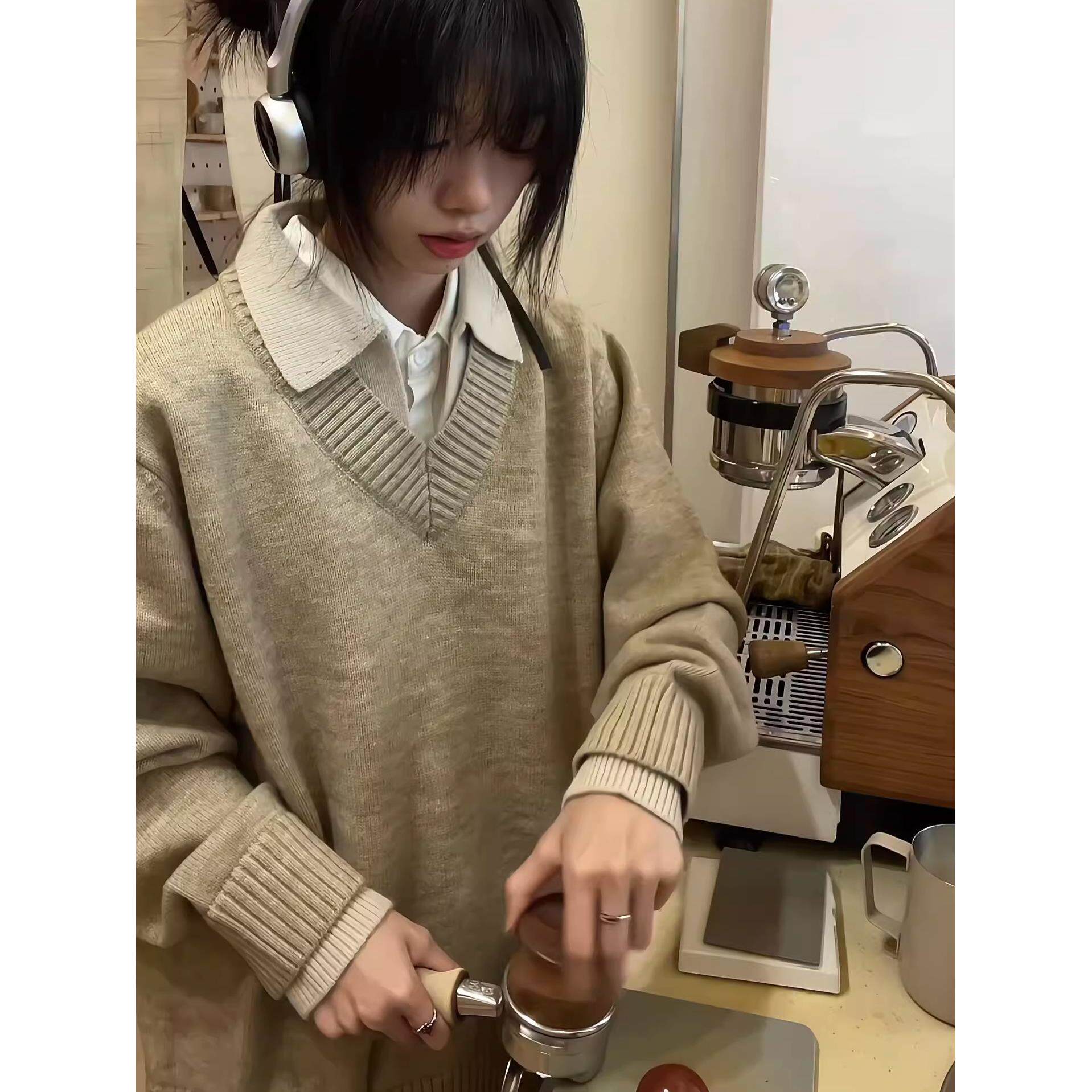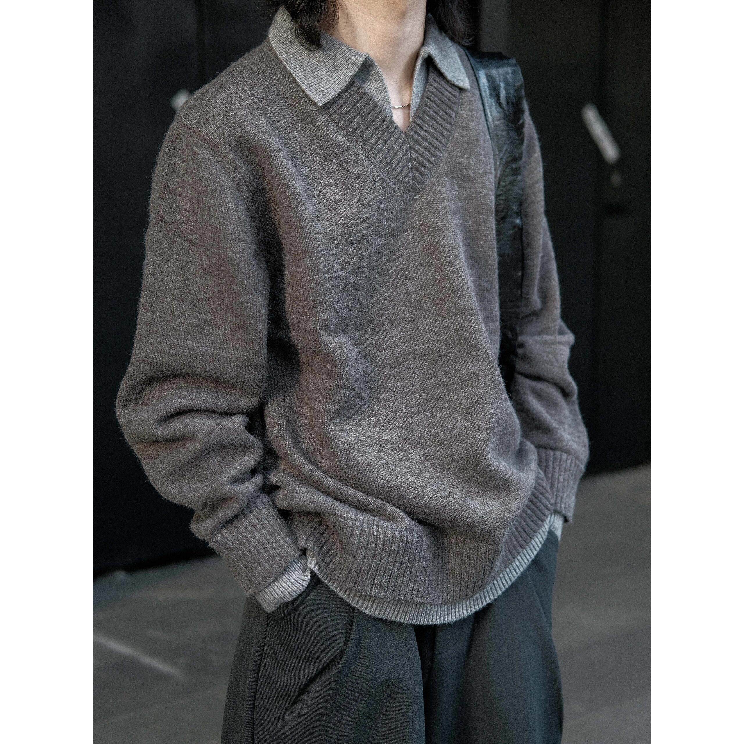 AMBSOM 假两件V领翻领纺羊绒polo氛围感老钱毛衣针织衫外套