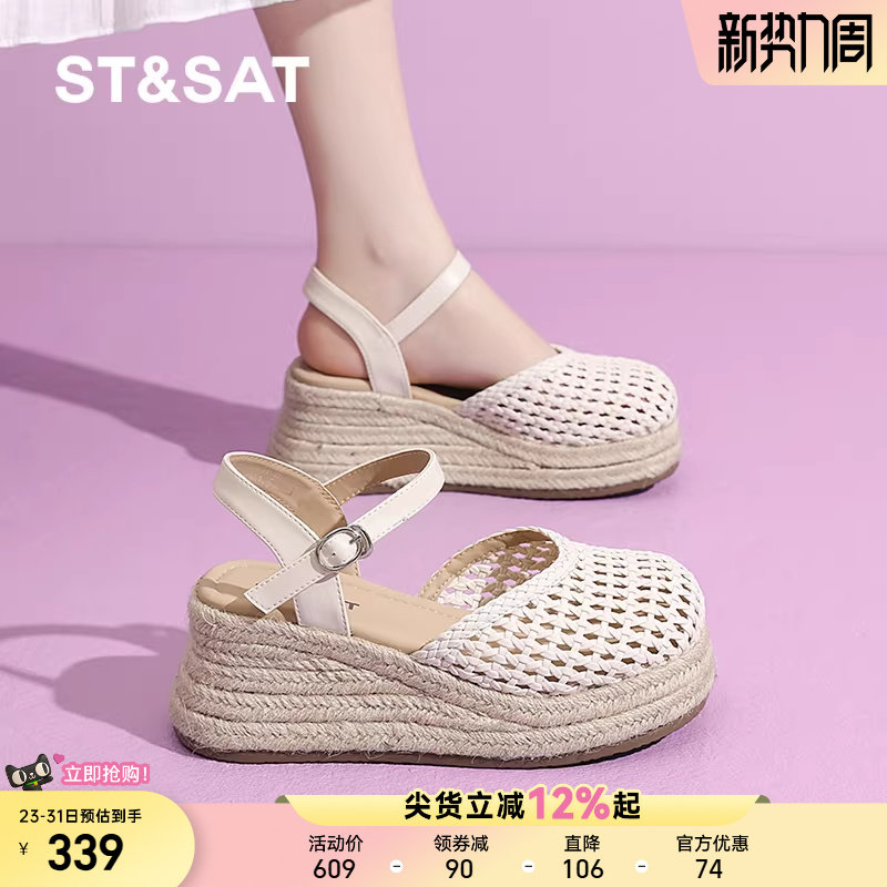 星期六厚底凉鞋女夏外穿2025新款编织镂空松糕底增高休闲沙滩鞋