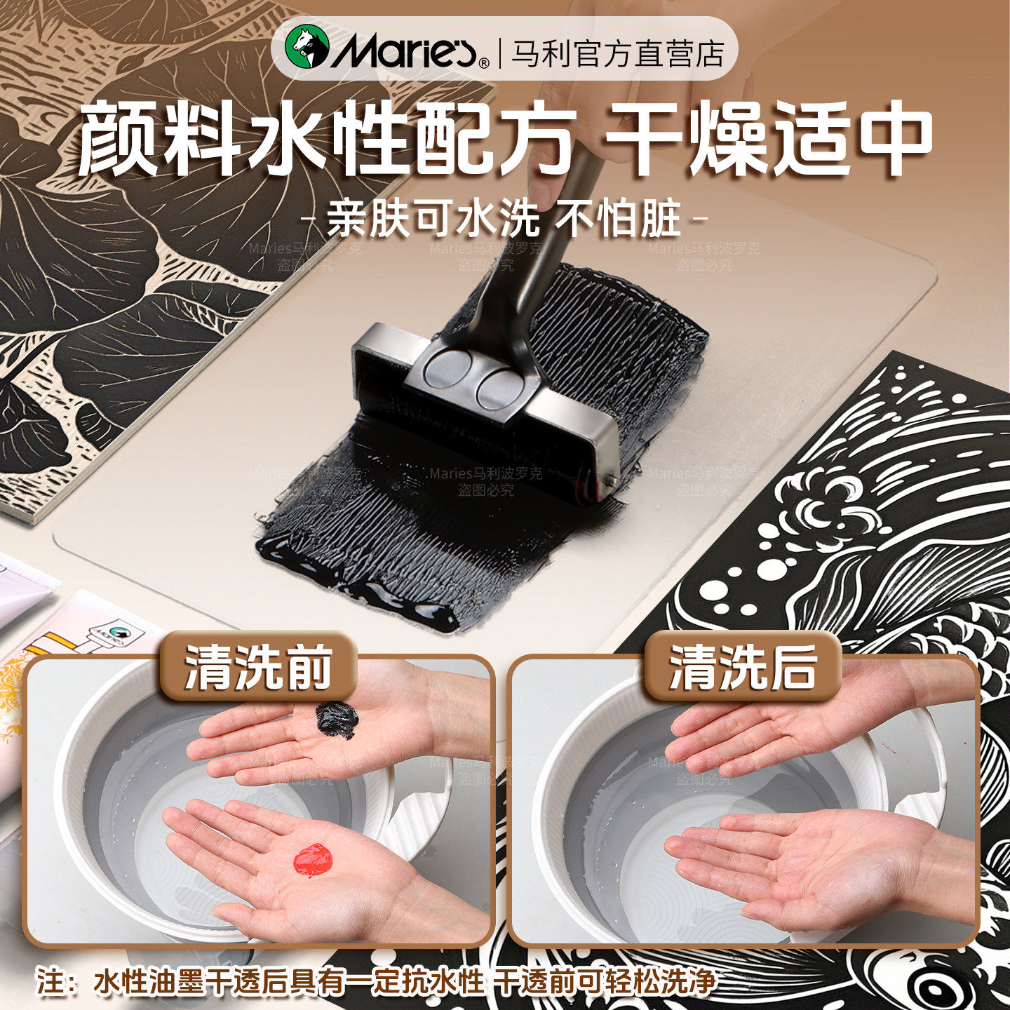 马利牌水性版画油墨颜料75ml黑色彩色30ml版画专用胶板滚筒工具套装可水洗凝胶板马莲木蘑菇彩色拓印雕刻木刻