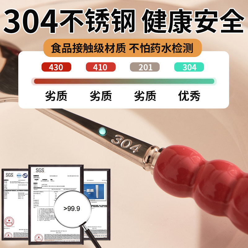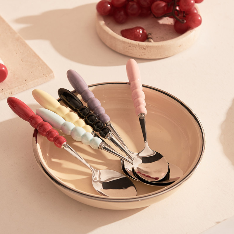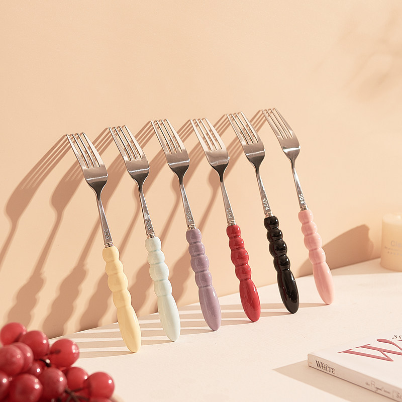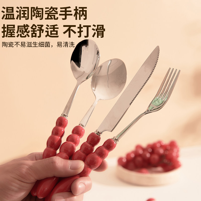 创意陶瓷柄圆勺吃饭勺子西餐餐叉家用304不锈钢食品级叉勺套装