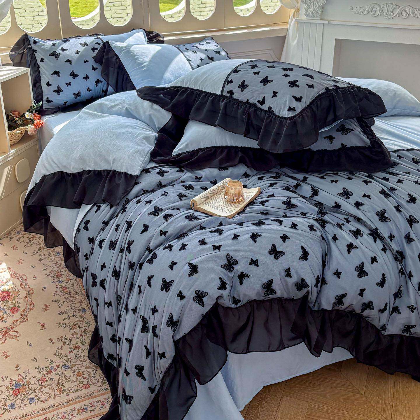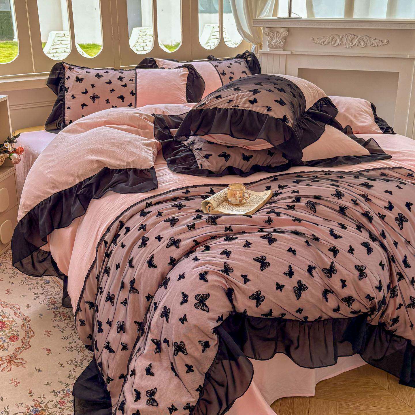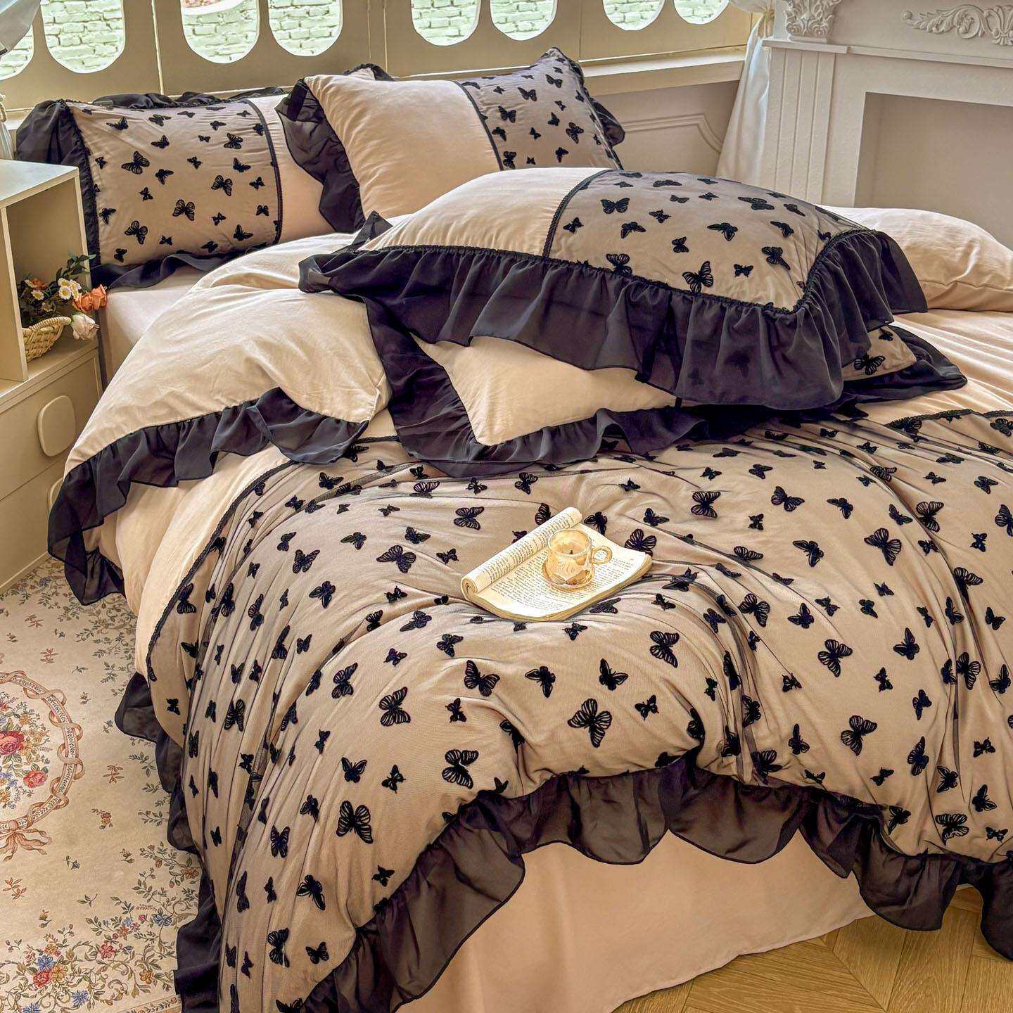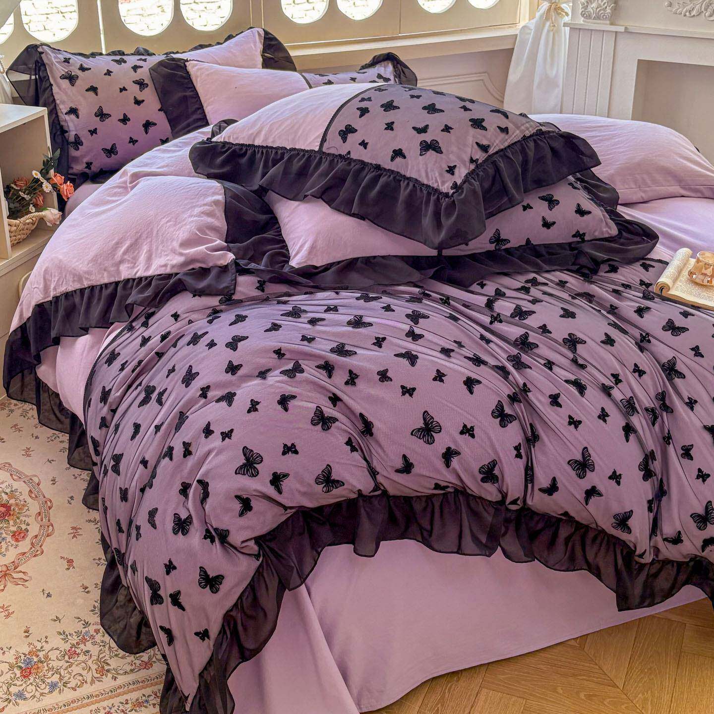 2026新款水洗棉花边四件套系列-蝴蝶梦境四件套水洗磨毛亲肤套件