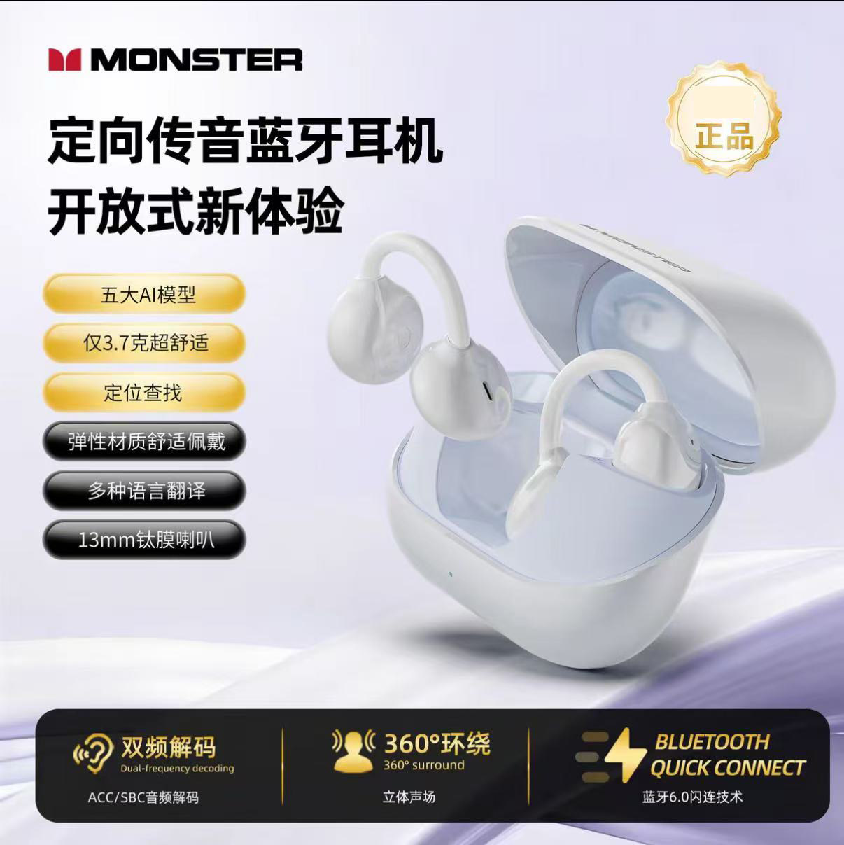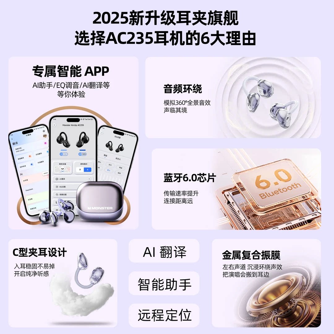 魔声AC235蓝牙无线耳机耳夹式运动降噪智能AI翻译高颜值2026新款